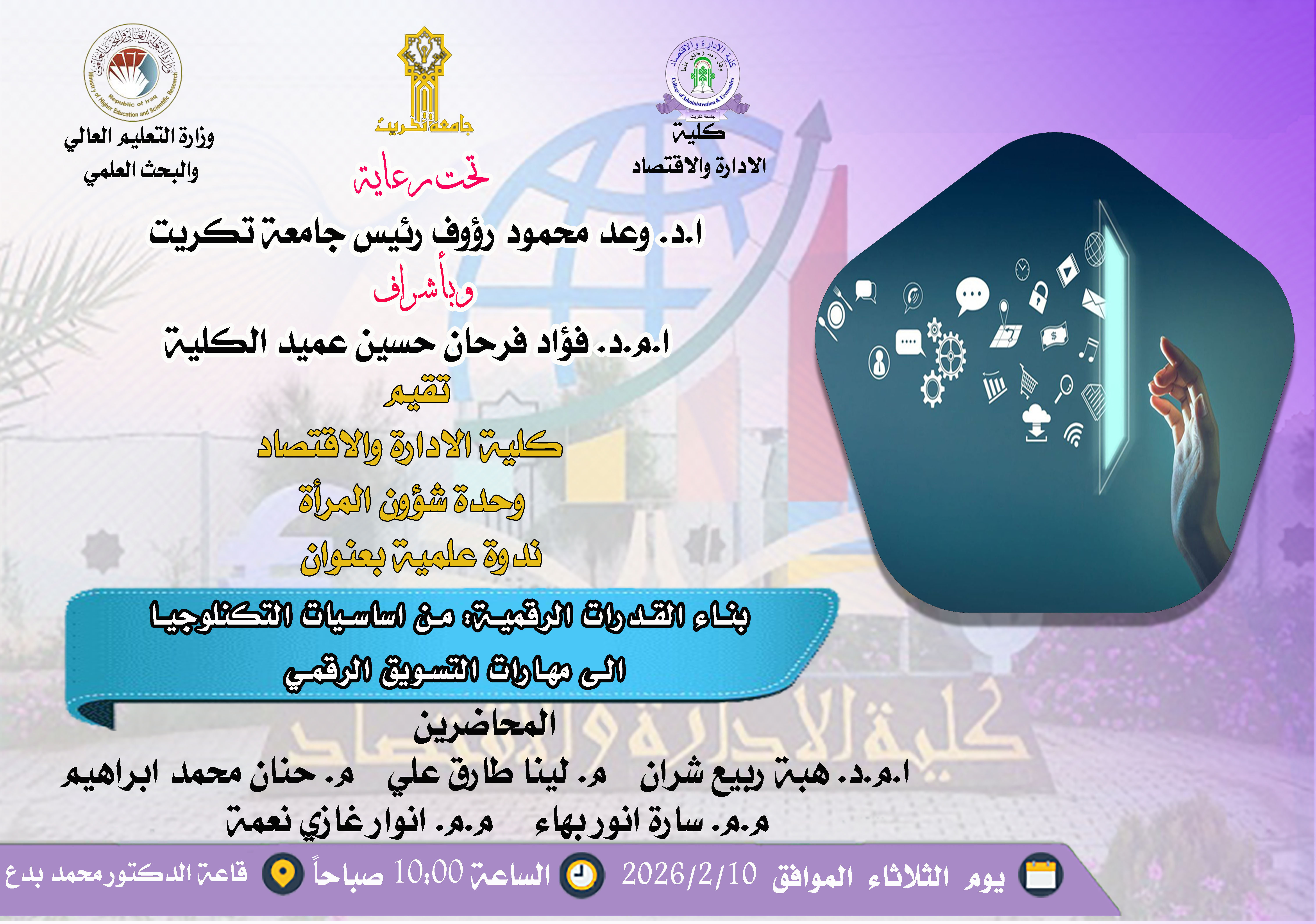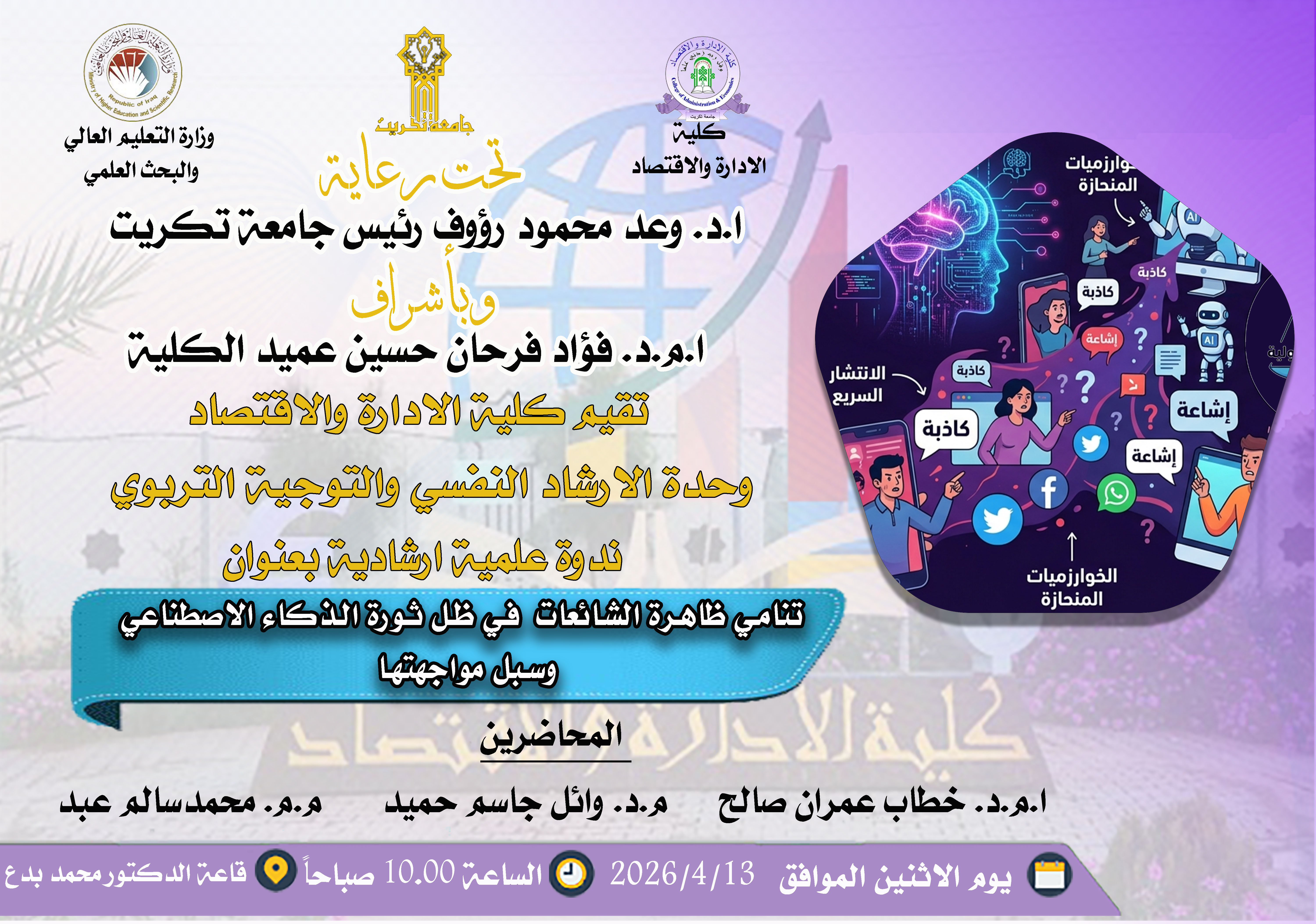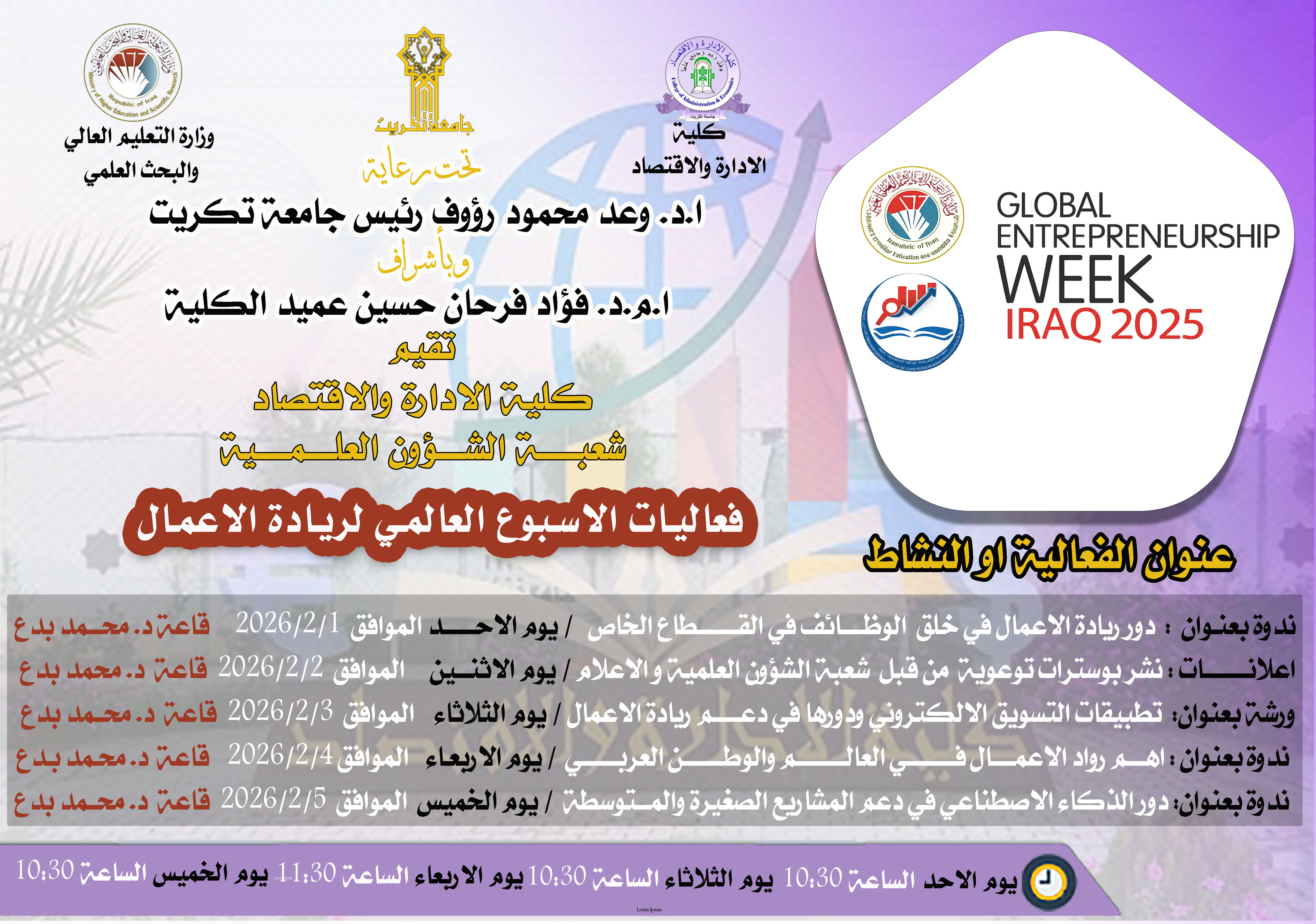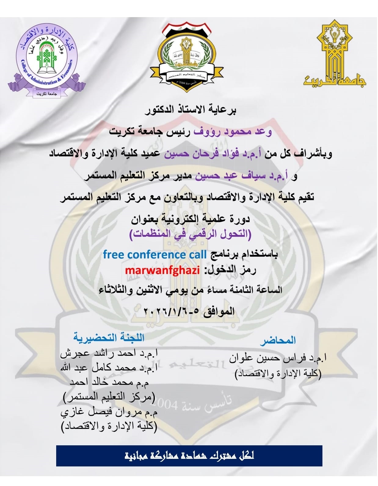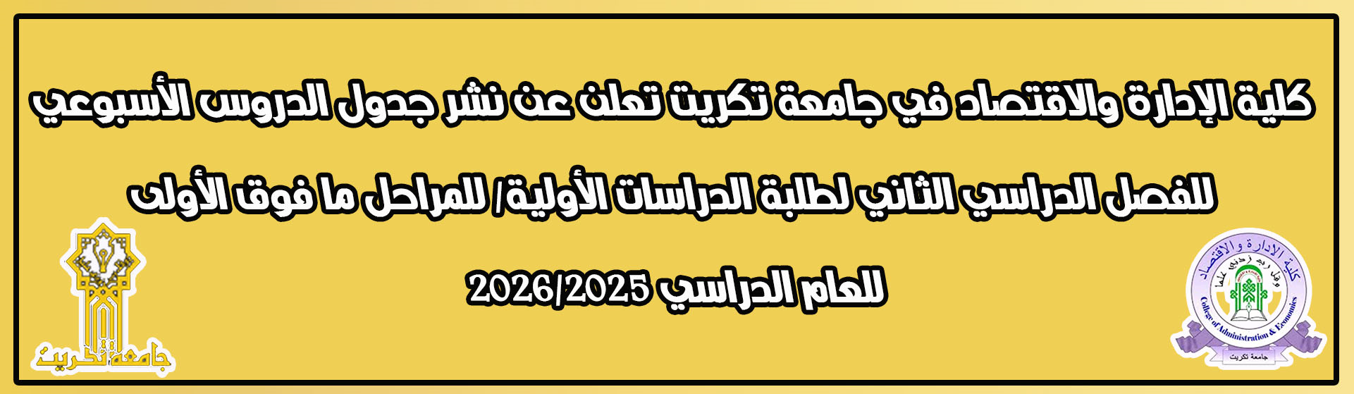 أسست كلية الإدارة والاقتصاد / جامعة تكريت في عام 2000 ، وقد ضمت الكلية في بداية تأسيسها على قسمين علميين فقط هما (قسم إدارة الإعمال , قسم الاقتصاد) وبلغ عدد الطلبة المقبولين في سنة التأسيس (388) طالبا وطالبة، وتضم حالياً ستة اقسام علمية للدراسات الأولية هي (قسم المحاسبة، قسم إدارة الاعمال، قسم الإدارة العامة، قسم المالية والمصرفية، قسم الاقتصاد وقسم إدارة التسويق) وتسعة برامج للدراسات العليا هي (دكتوراه محاسبة، دكتوراه إدارة الاعمال، دكتوراه اقتصاد، ماجستير محاسبة، ماجستير إدارة الاعمال، ماجستير مالية ومصرفية، ماجستير اقتصاد، دبلوم عالي في التخطيط الاستراتيجي معادل للماجستير/ امدة سنتان، دبلوم عالي في التخطيط الاستراتيجي/ سنة واحدة).s