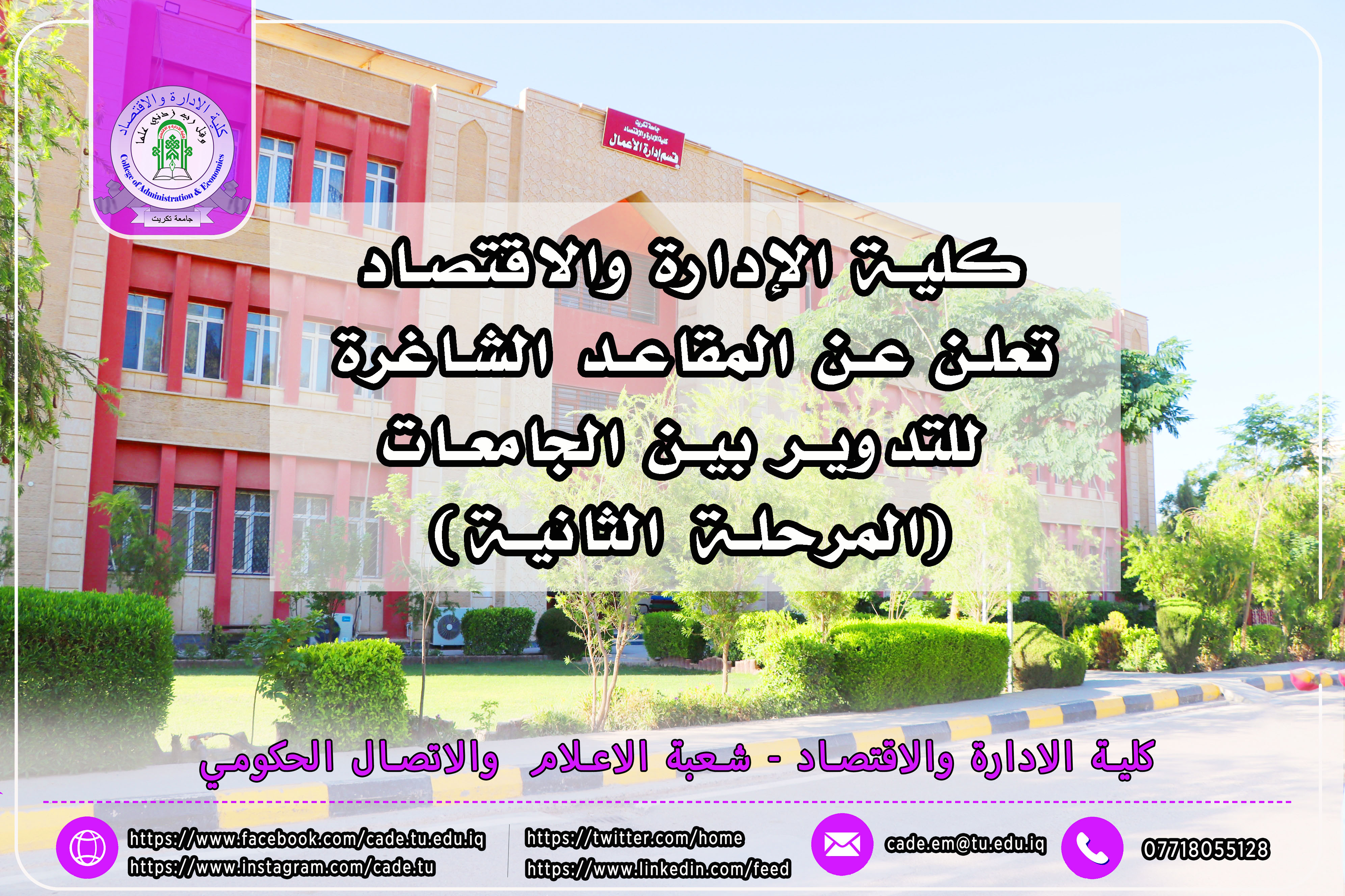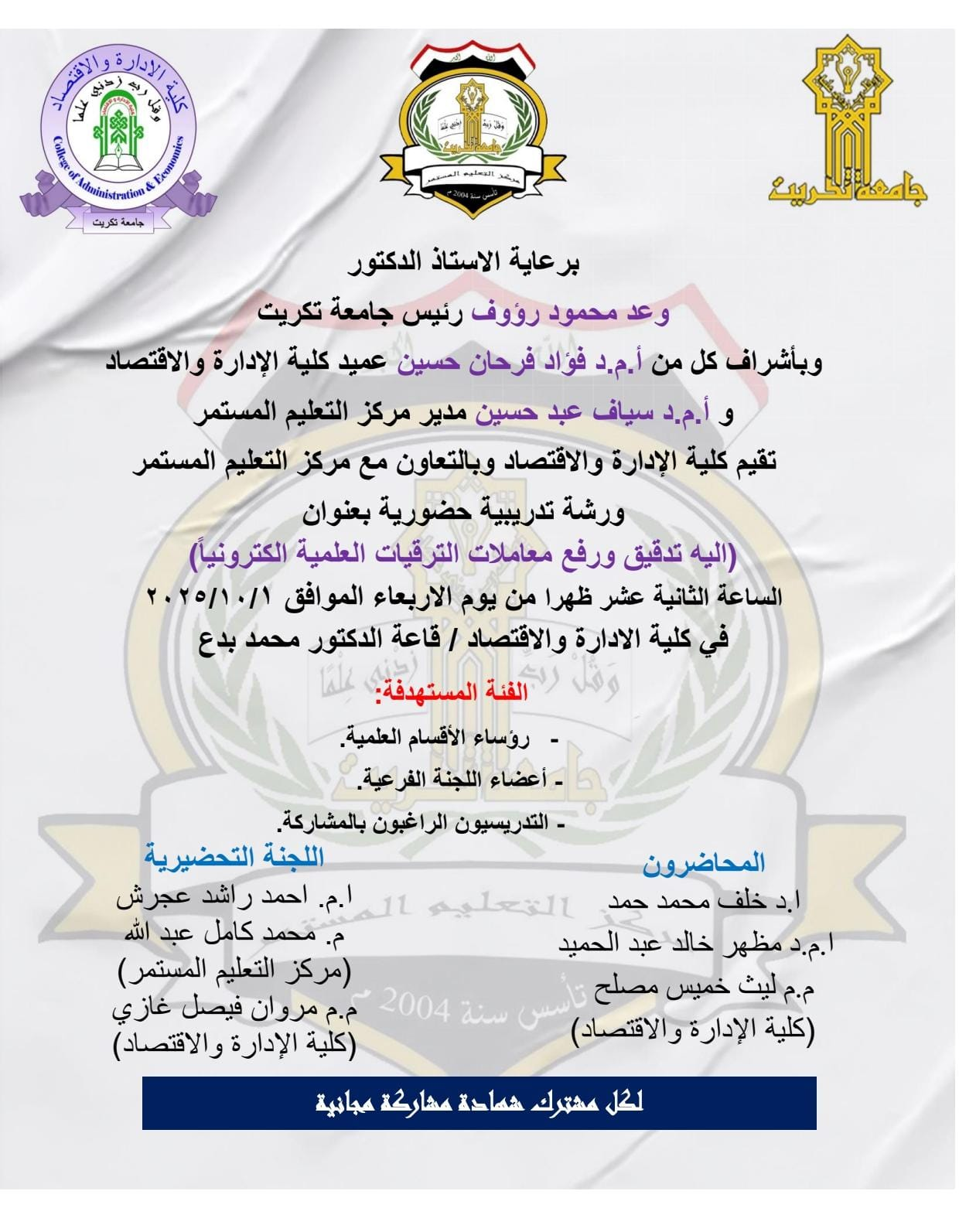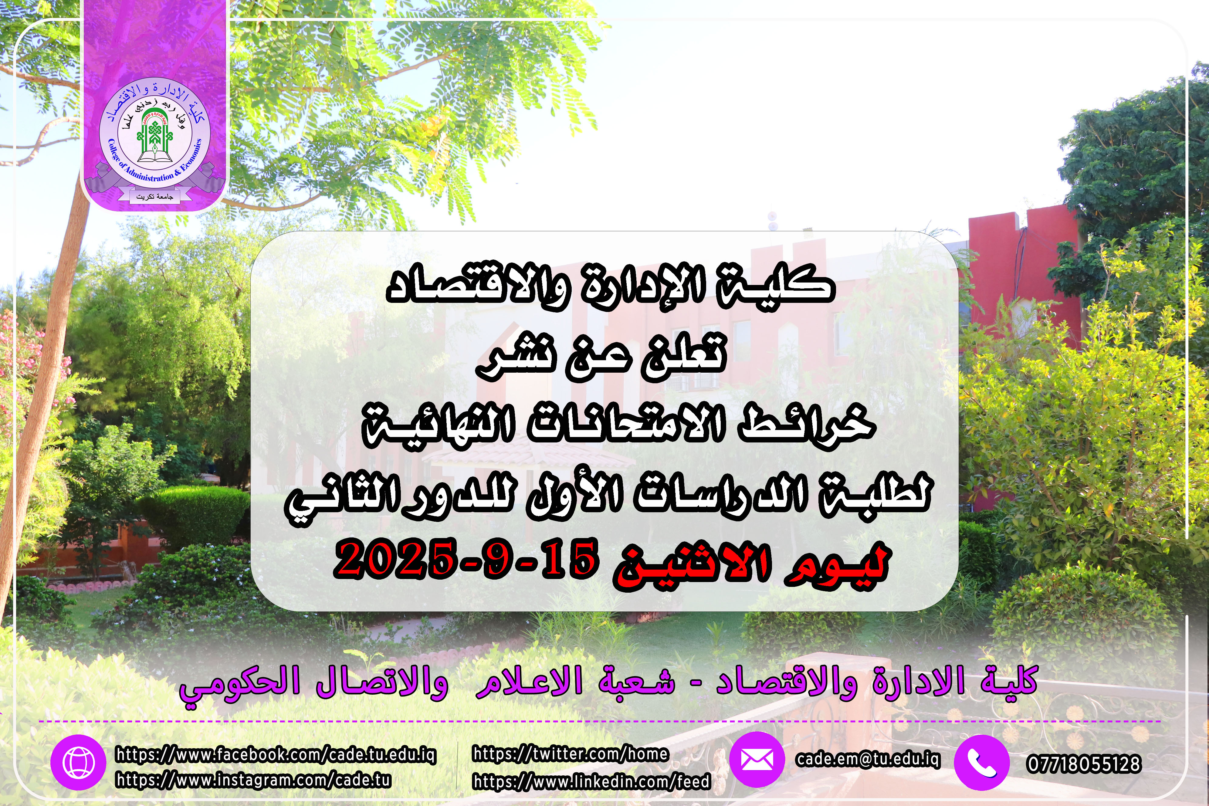 أسست كلية الإدارة والاقتصاد / جامعة تكريت في عام 2000 ، وقد ضمت الكلية في بداية تأسيسها على قسمين علميين فقط هما (قسم إدارة الإعمال , قسم الاقتصاد) وبلغ عدد الطلبة المقبولين في سنة التأسيس (388) طالبا وطالبة، وتضم حالياً ستة اقسام علمية للدراسات الأولية هي (قسم المحاسبة، قسم إدارة الاعمال، قسم الإدارة العامة، قسم المالية والمصرفية، قسم الاقتصاد وقسم إدارة التسويق) وتسعة برامج للدراسات العليا هي (دكتوراه محاسبة، دكتوراه إدارة الاعمال، دكتوراه اقتصاد، ماجستير محاسبة، ماجستير إدارة الاعمال، ماجستير مالية ومصرفية، ماجستير اقتصاد، دبلوم عالي في التخطيط الاستراتيجي معادل للماجستير/ امدة سنتان، دبلوم عالي في التخطيط الاستراتيجي/ سنة واحدة).s