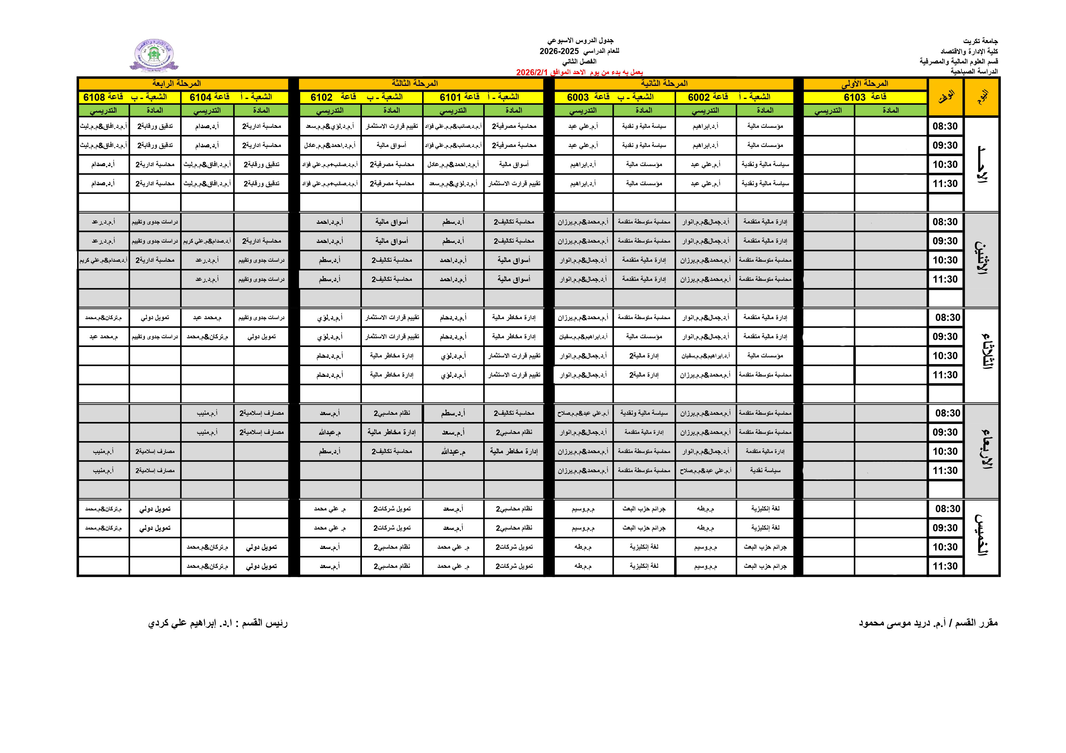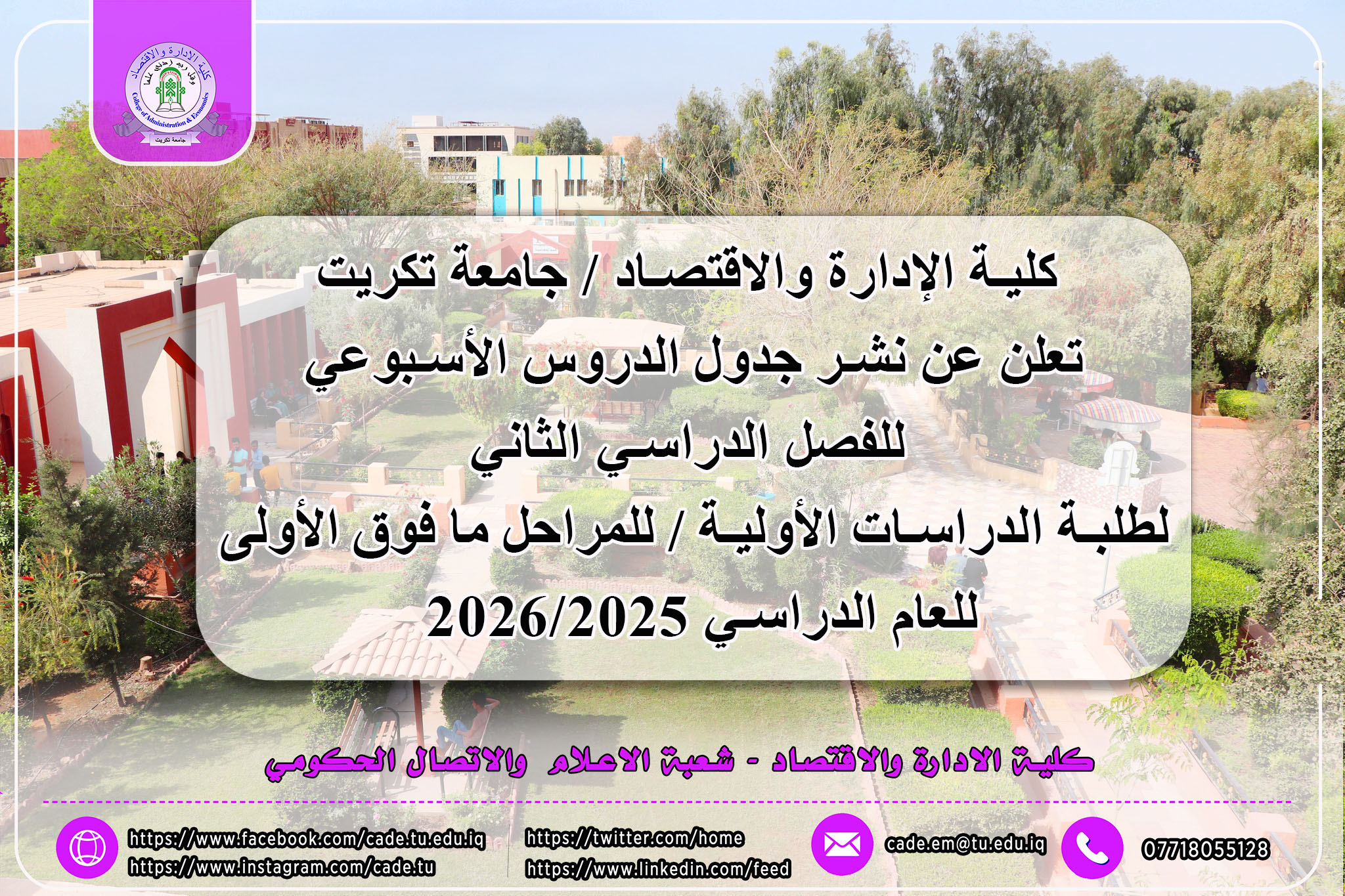استنادًا إلى كتاب وزارة التعليم العالي والبحث العلمي / دائرة الدراسات والتخطيط والمتابعة / قسم الدراسات والتخطيط، والمتضمن التقويم الجامعي للعام الدراسي 2025–2026 للمراحل ما فوق الأولى، ووفقًا لما ورد في الفقرة رابعًا التي تنص على بدء الفصل الدراسي الثاني، تعلن عمادة كلية الإدارة والاقتصاد عن نشر جدول الدروس الأسبوعي لطلبة الدراسات الأولية للدراستين الصباحية والمسائية.