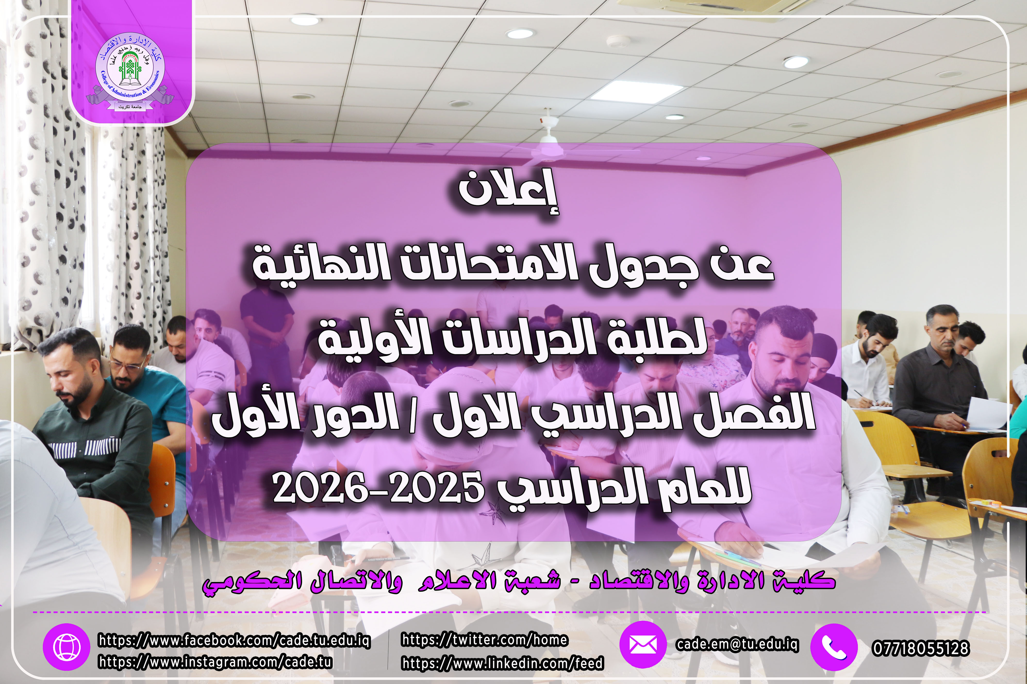 تُعلن عمادة كلية الإدارة والاقتصاد عن نشر جدول الامتحانات النهائية لطلبة الدراسات الأولية للفصل الدراسي الأول / الدور الأول للعام الدراسي 2025–2026.