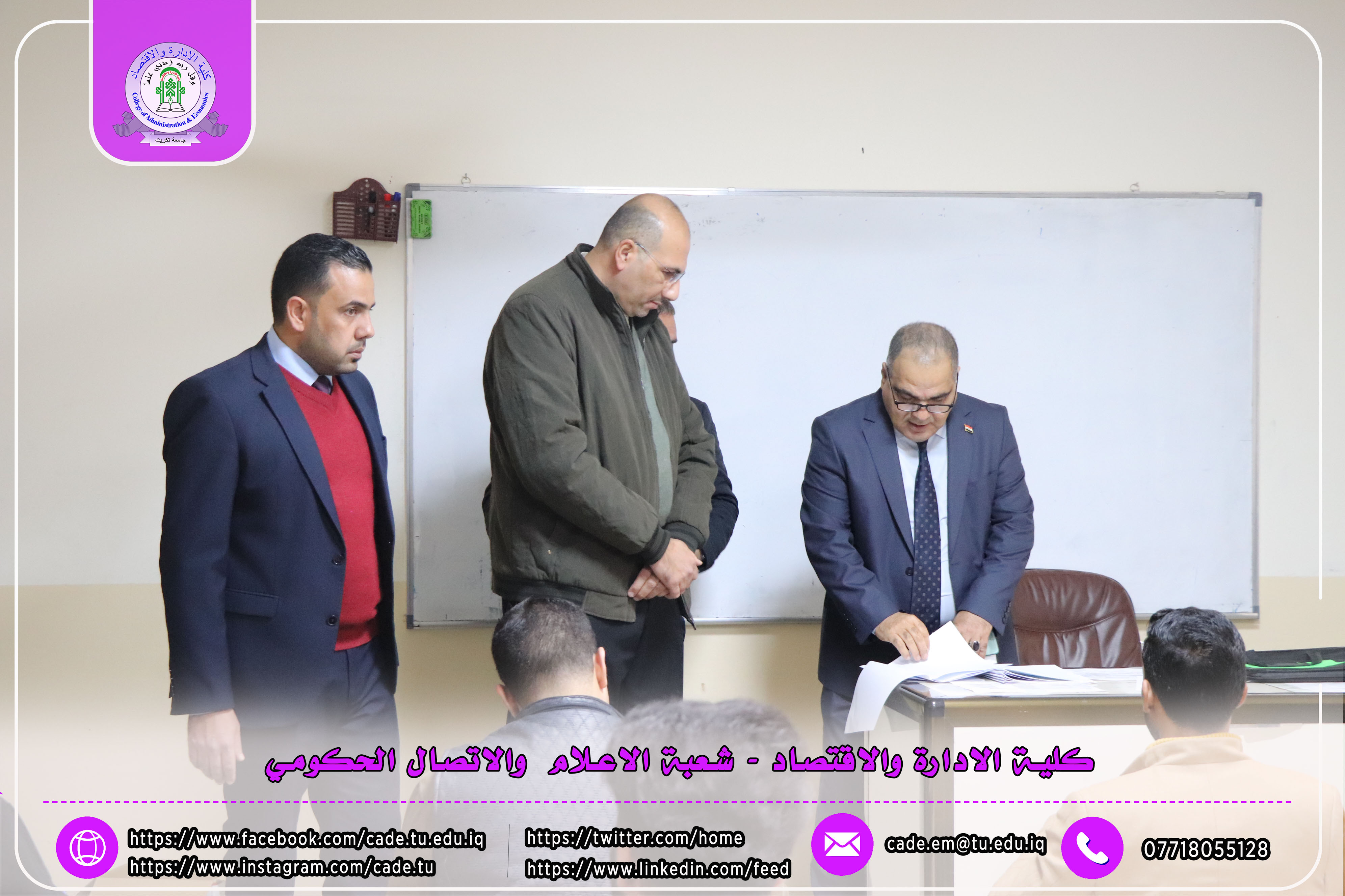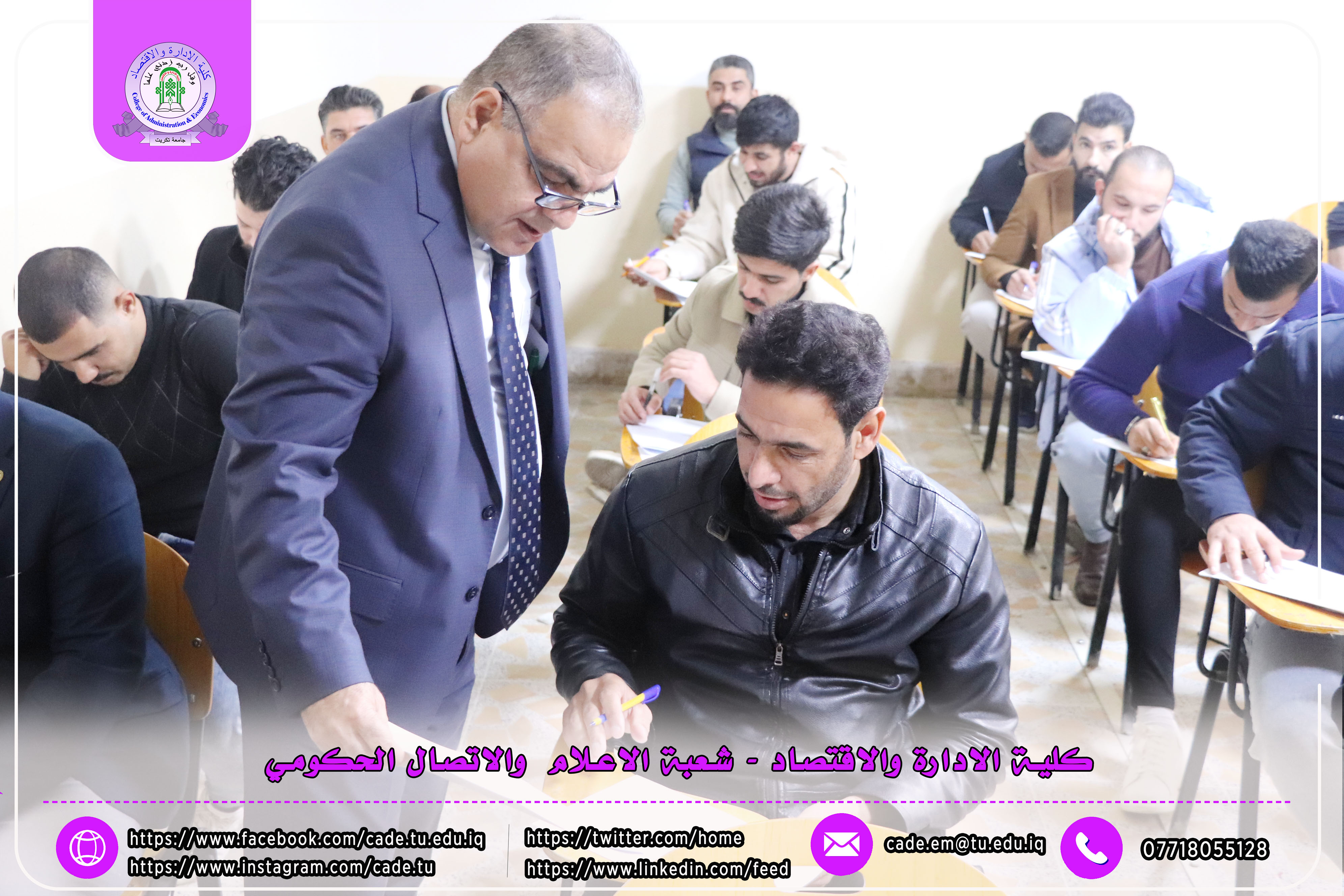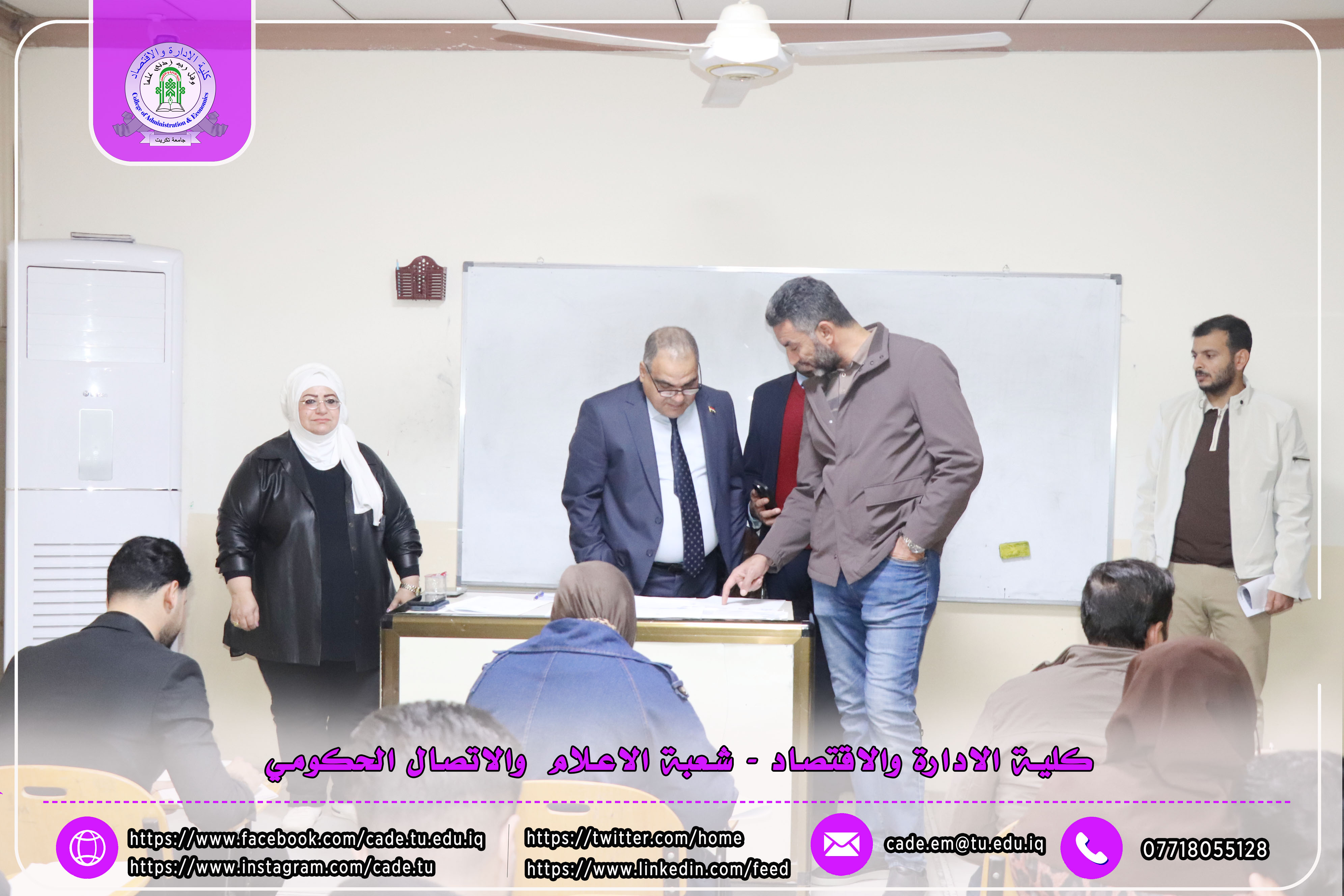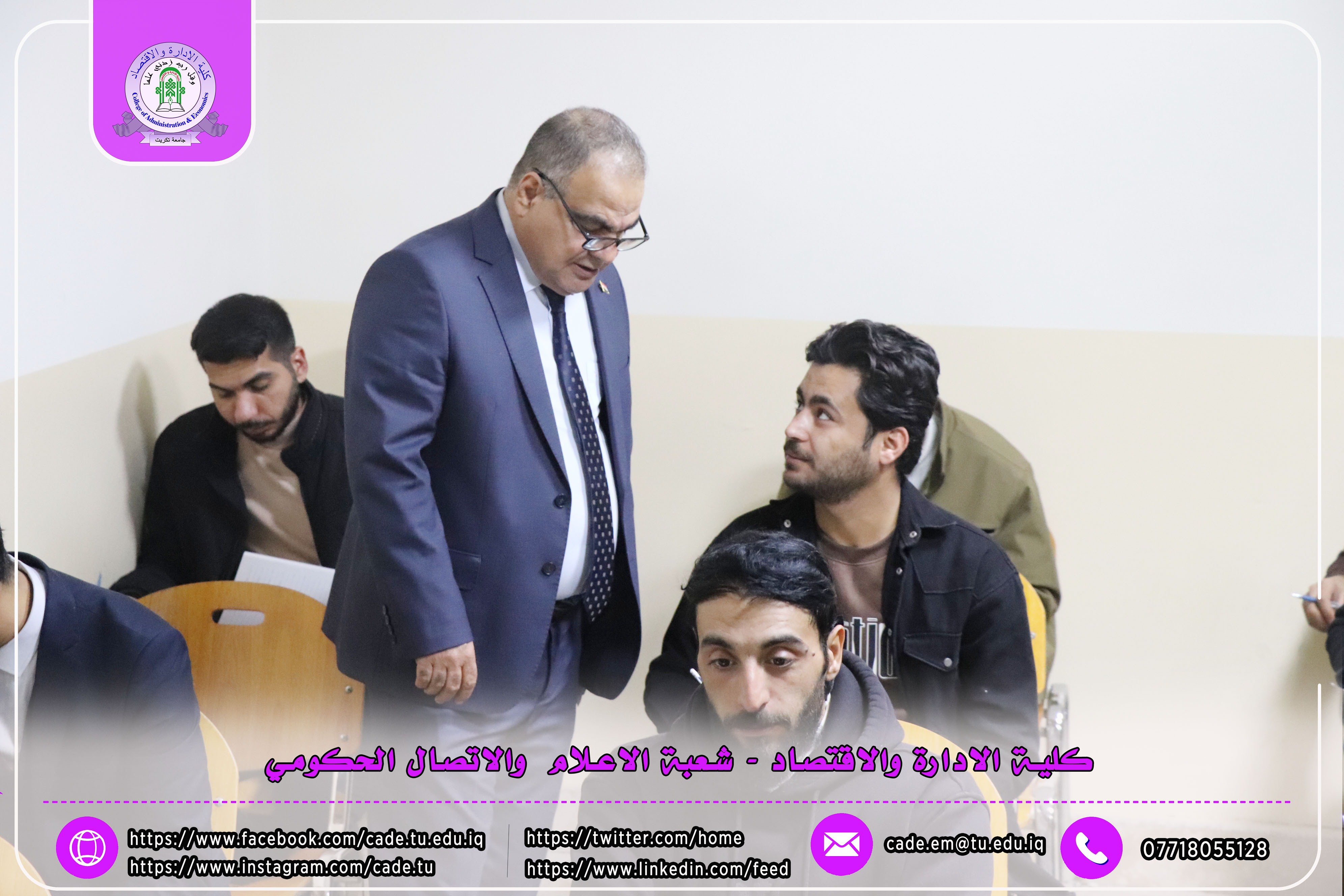 ضمن سلسلة الزيارات والجولات التفقدية التي تجريها رئاسة جامعة تكريت لمتابعة سير الامتحانات النهائية في كليات الجامعة، زار الأستاذ الدكتور حسن حسين إبراهيم، مساعد رئيس الجامعة للشؤون العلمية، كلية الإدارة والاقتصاد، وذلك يوم الأحد الموافق 2026/1/18.