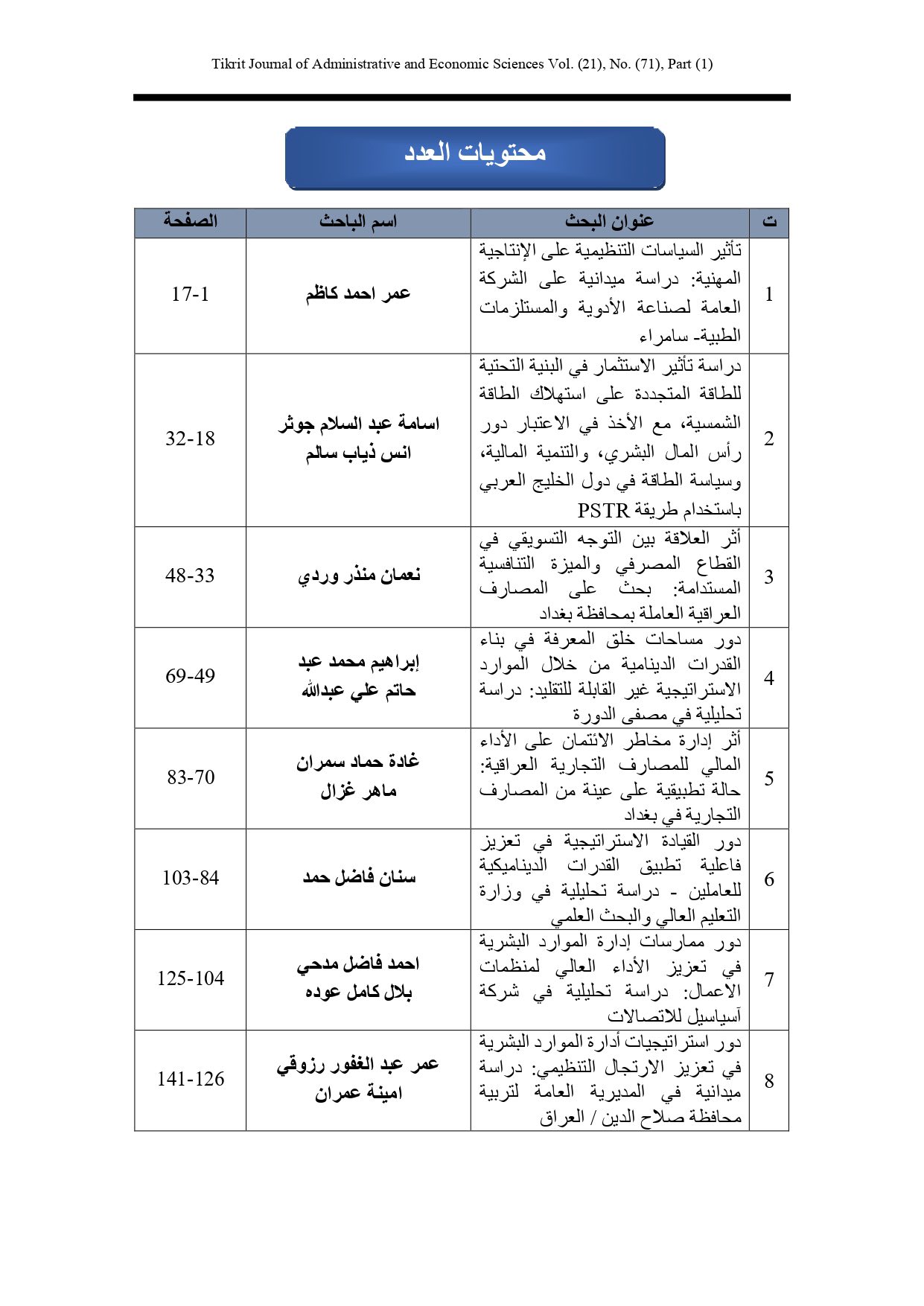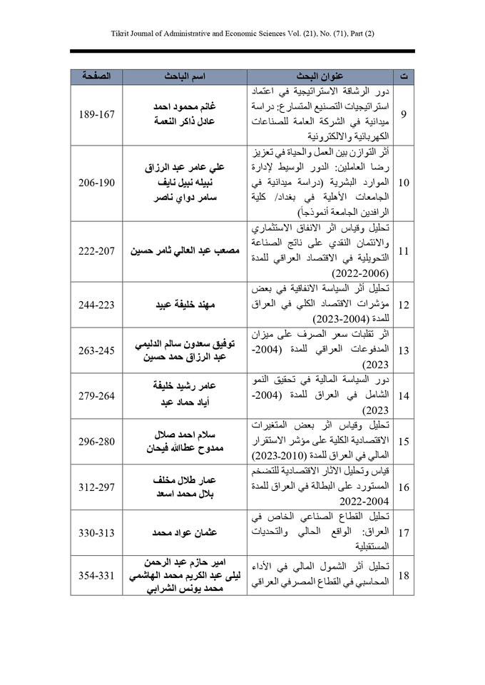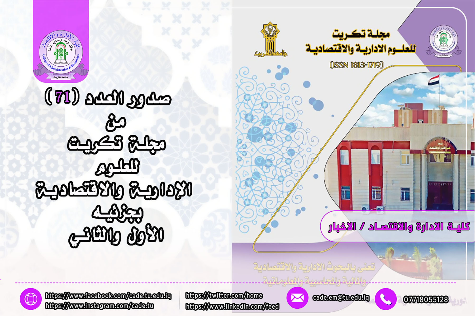 يسر عمادة الإدارة والاقتصاد / هيئة تحرير مجلة تكريت للعلوم الإدارية والاقتصادية أن تعلن عن صدور العدد (71) من المجلة، بجزئيه الأول والثاني.