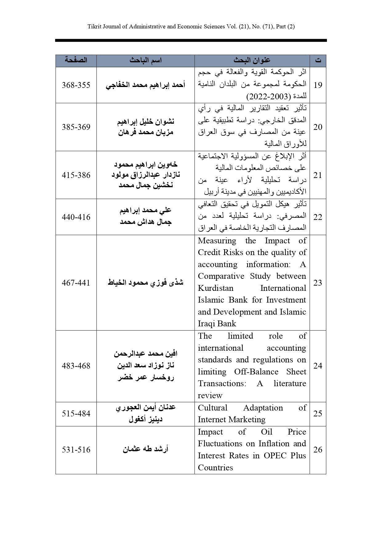 وقد تضمن الجزء الأول من هذا العدد (28) بحثاً علمياً محكّماً تناولت موضوعات متنوعة في المجالات الإدارية والاقتصادية والمالية، أما الجزء الثاني، فقد اشتمل أيضاً على (28) بحثاً وقد أسهمت هذه البحوث في تعزيز المحتوى الأكاديمي وتوسيع آفاق البحث العلمي المتخصص.