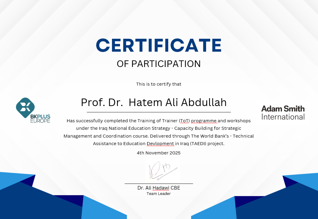 في إطار دعم وتطوير القدرات الأكاديمية والإدارية، حصل التدريسي الأستاذ الدكتور حاتم علي عبدالله، أحد ملاكات كلية الإدارة والاقتصاد، على شهادة تدريب المدربين (TOT) ضمن استراتيجية التعليم الوطنية العراقية – بناء القدرات في الإدارة الاستراتيجية والتنسيق.