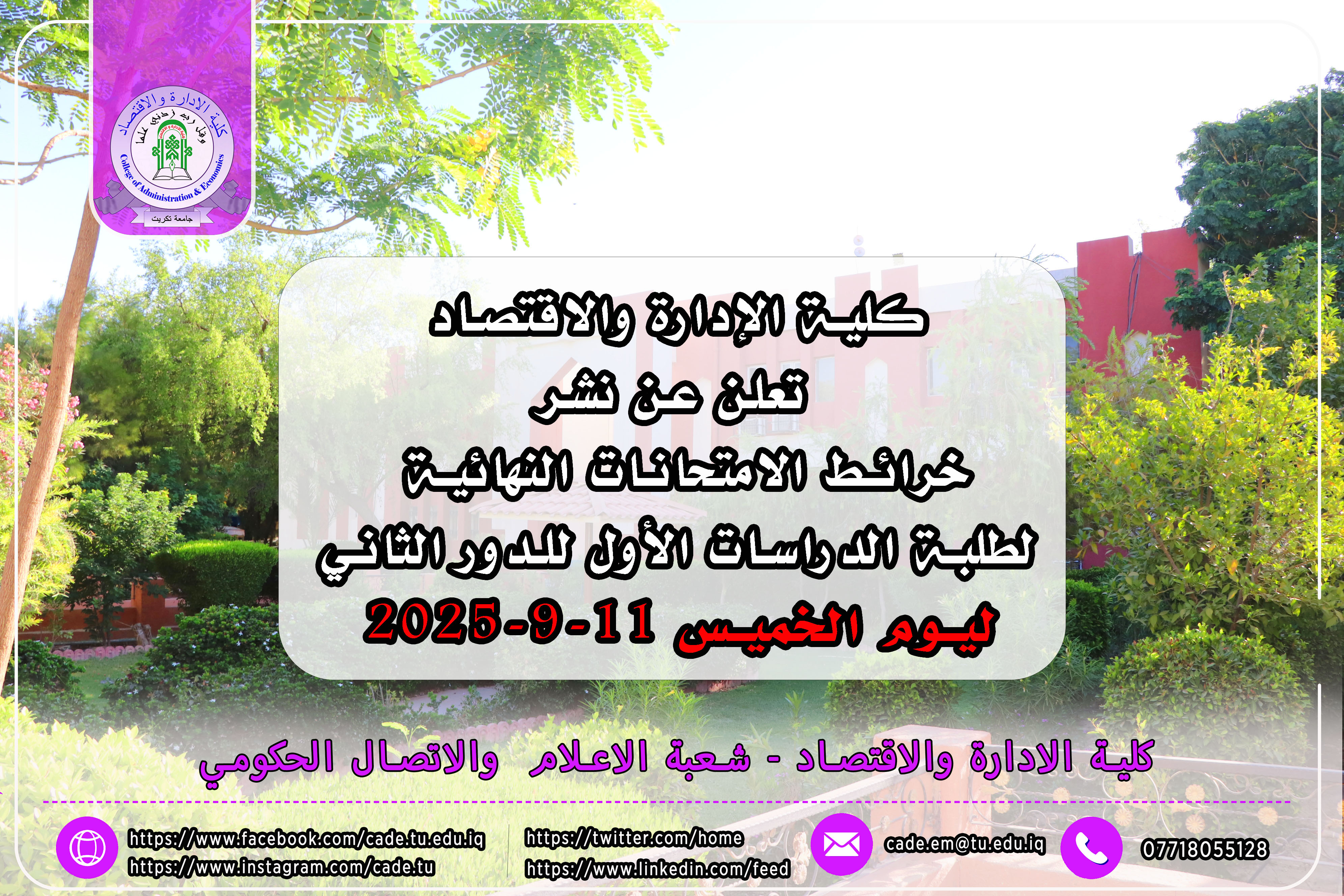 تُعلن عمادة كلية الإدارة والاقتصاد في جامعة تكريت عن نشر خرائط الامتحانات النهائية لطلبة الدراسات الأولية (الصباحية والمسائية) للدور الثاني للعام الدراسي 2024-2025، وذلك ليوم الخميس الموافق 11-9-2025.