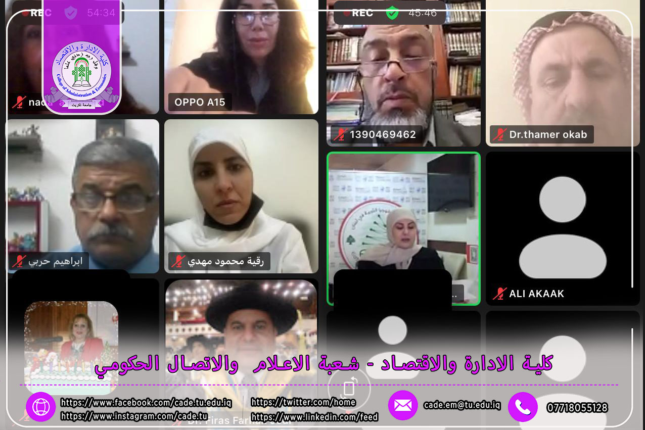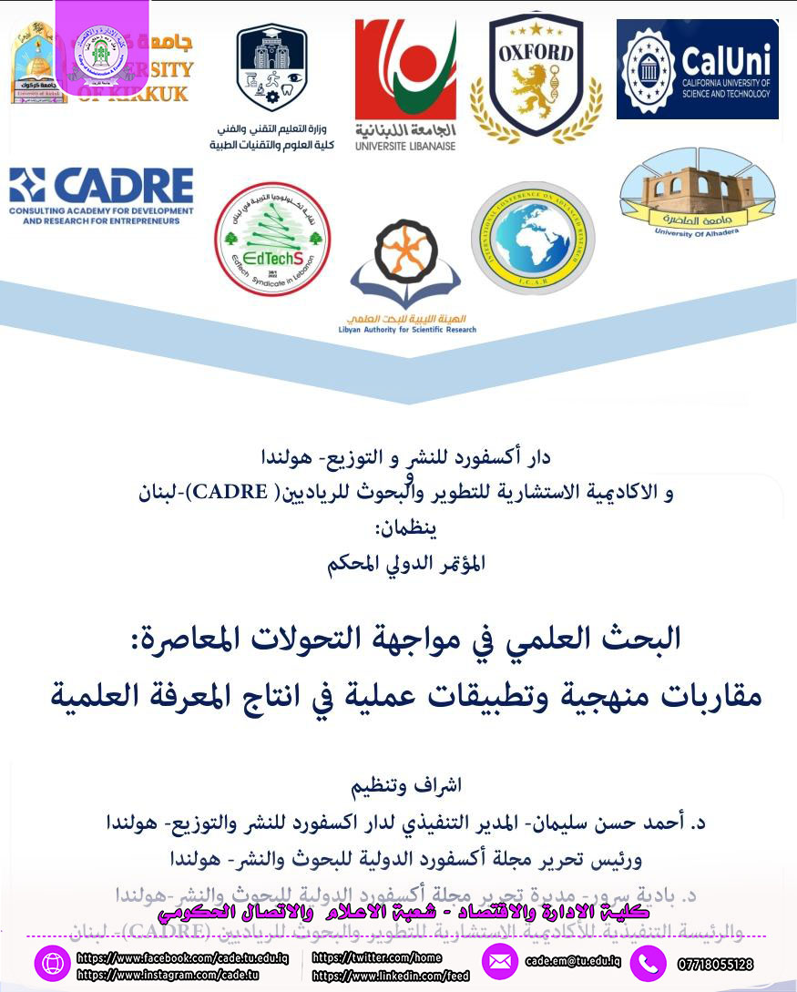 في إطار تعزيز التعاون الأكاديمي الدولي والانفتاح على التجارب العلمية العالمية، شارك عدد من تدريسيي كلية الإدارة والاقتصاد / جامعة تكريت في أعمال المؤتمر الدولي العلمي المحكّم (ICAR 2026)، الذي عُقد تحت عنوان (( البحث العلمي في مواجهة التحولات المعاصرة: مقاربات منهجية وتطبيقات عملية في إنتاج المعرفة العلمية))، وذلك خلال المدة 11–12 نيسان 2026 في مدينة بيروت – لبنان، وبصيغة إلكترونية عبر تطبيق (Zoom) نظرًا للظروف الراهنة، بتنظيم مشترك بين دار أكسفورد للنشر والتوزيع – هولندا والأكاديمية الاستشارية للتطوير والبحوث للرياديين (CADRE) – لبنان.