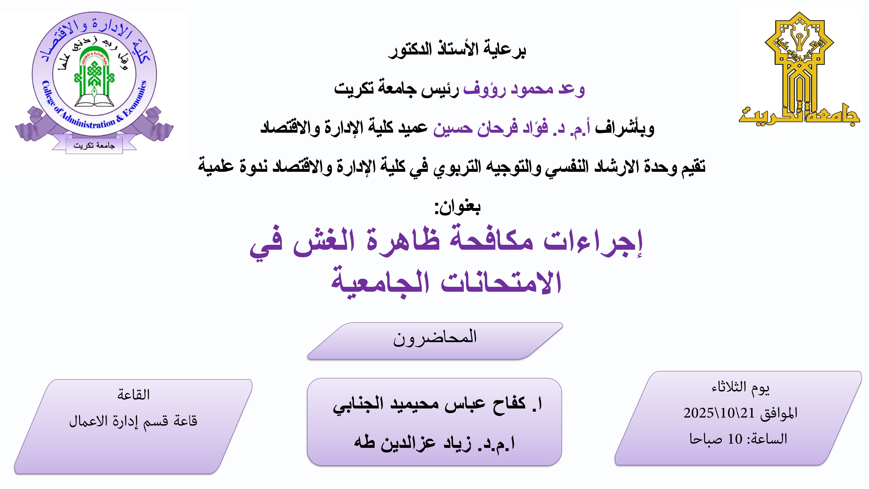 ستُعقد بأذن الله تعالى ندوة علمية بعنوان اجراءات مكافحة ظاهرة الغش في الامتحانات الجامعية