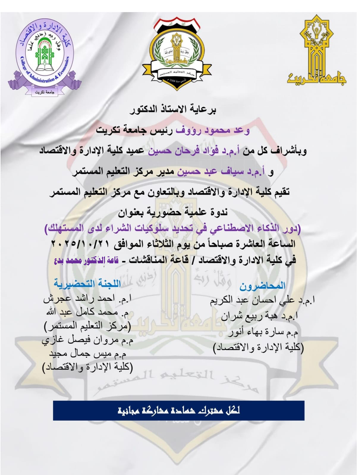 ستُعقد بأذن الله تعالى ندوة علمية بعنوان دور الذكاء الاصطناعي في تحديد سلوكيات الشراء لدى المستهلك