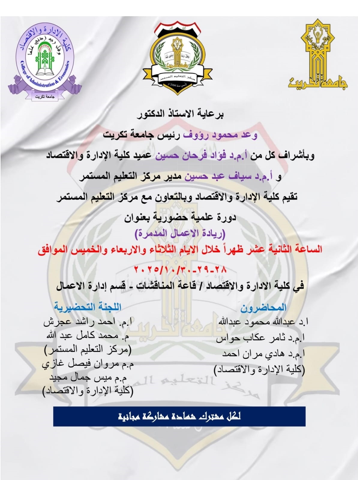 ستُعقد بأذن الله تعالى دورة علمية حضورية بعنوان ريادة الاعمال المدمرة