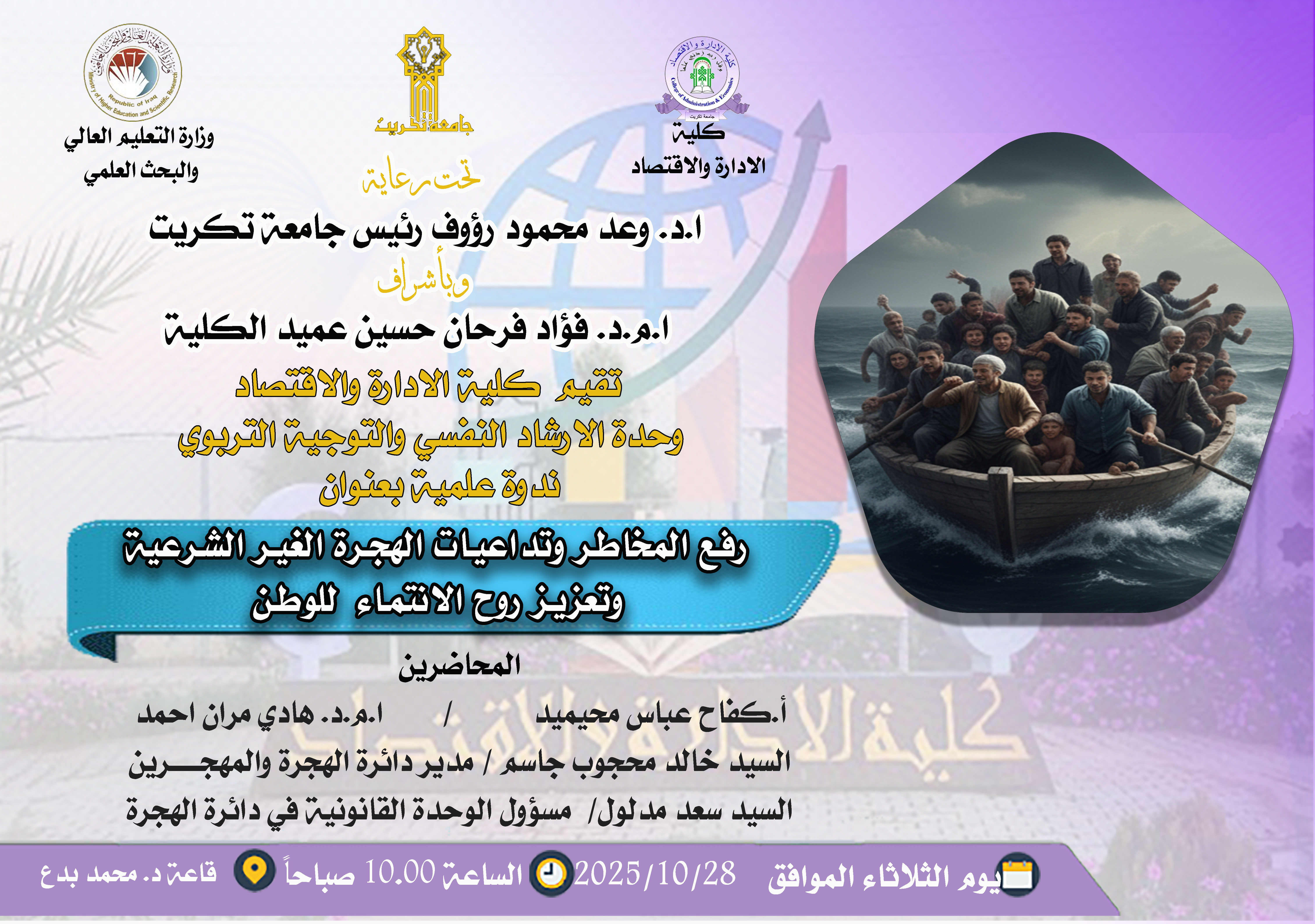 ستُعقد بأذن الله تعالى ندوة علمية بعنوان رفع المخاطر وتداعيات الهجرة الغير الشرعية وتعزيز روح الانتماء للوطن