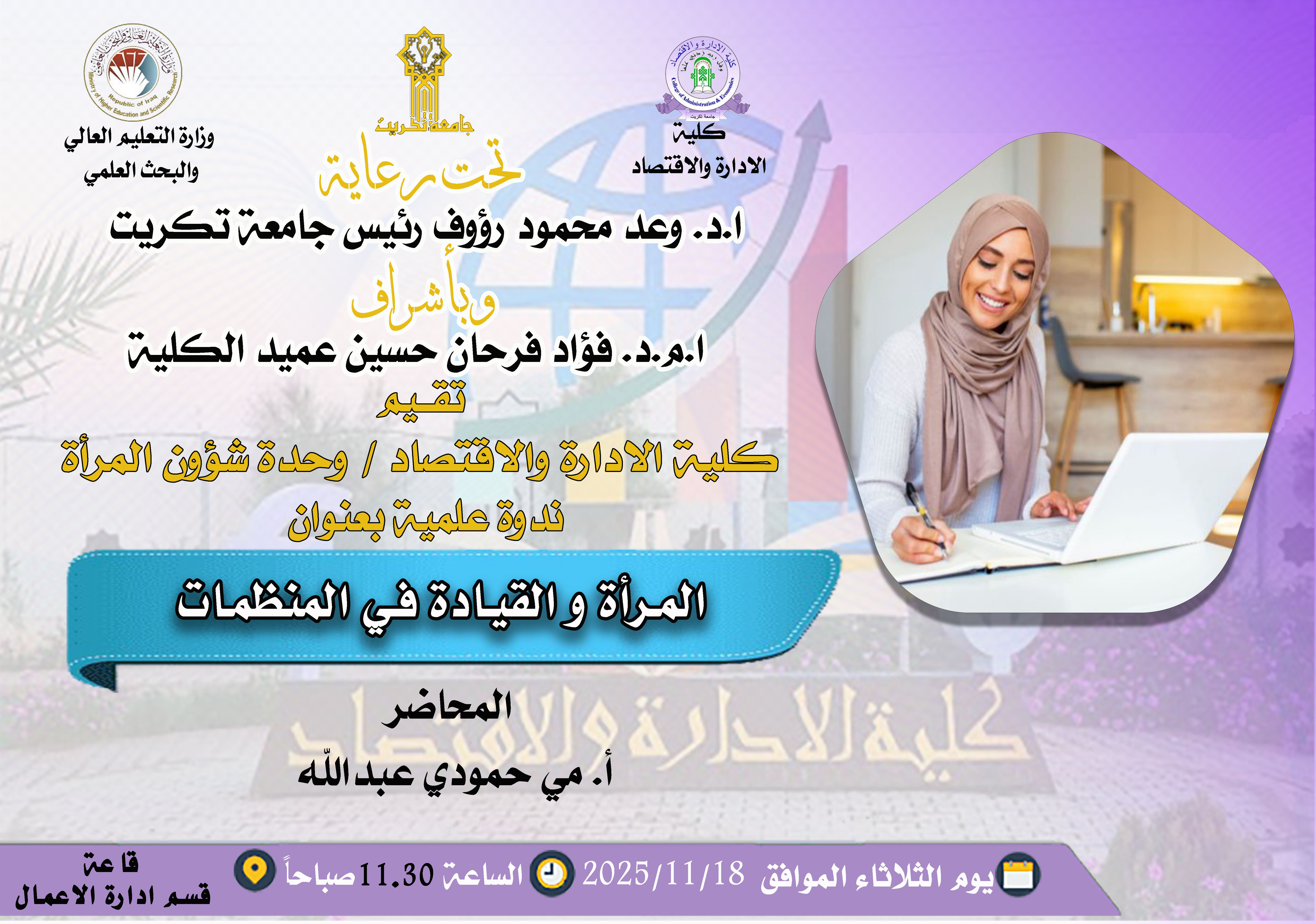 ستُعقد بأذن الله تعالى ندوة علمية بعنوان المرأة و القيادة في المنظمات