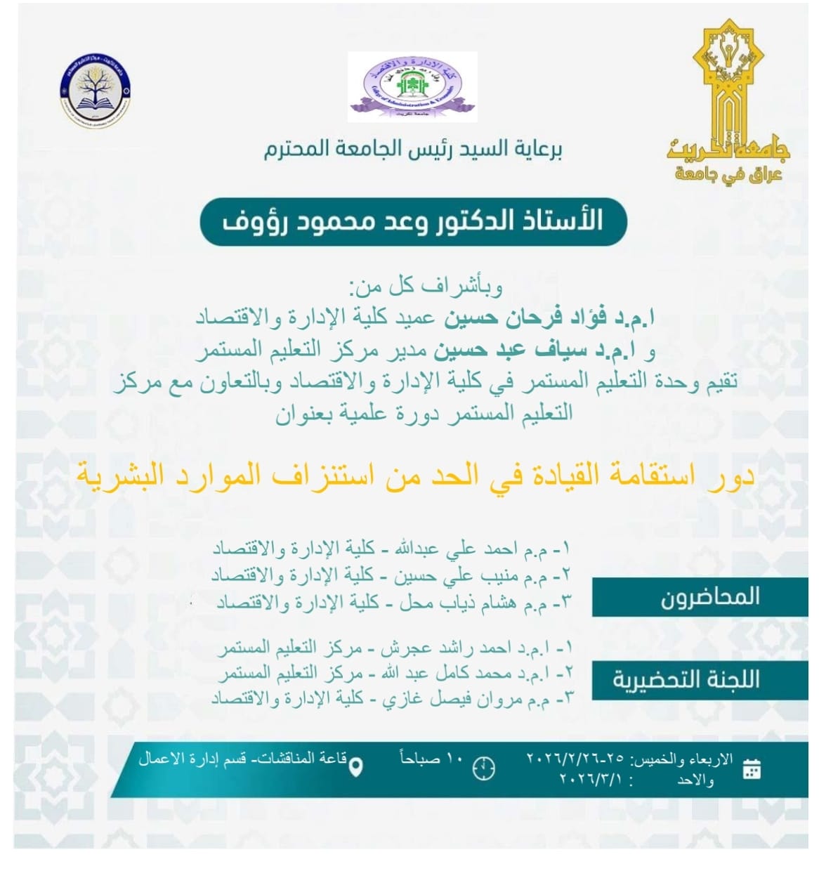 ستُعقد بإذنِ الله تعالى دورة علمية بعنوان دور استقامة القيادة في الحد من استنزاف الموارد البشرية
