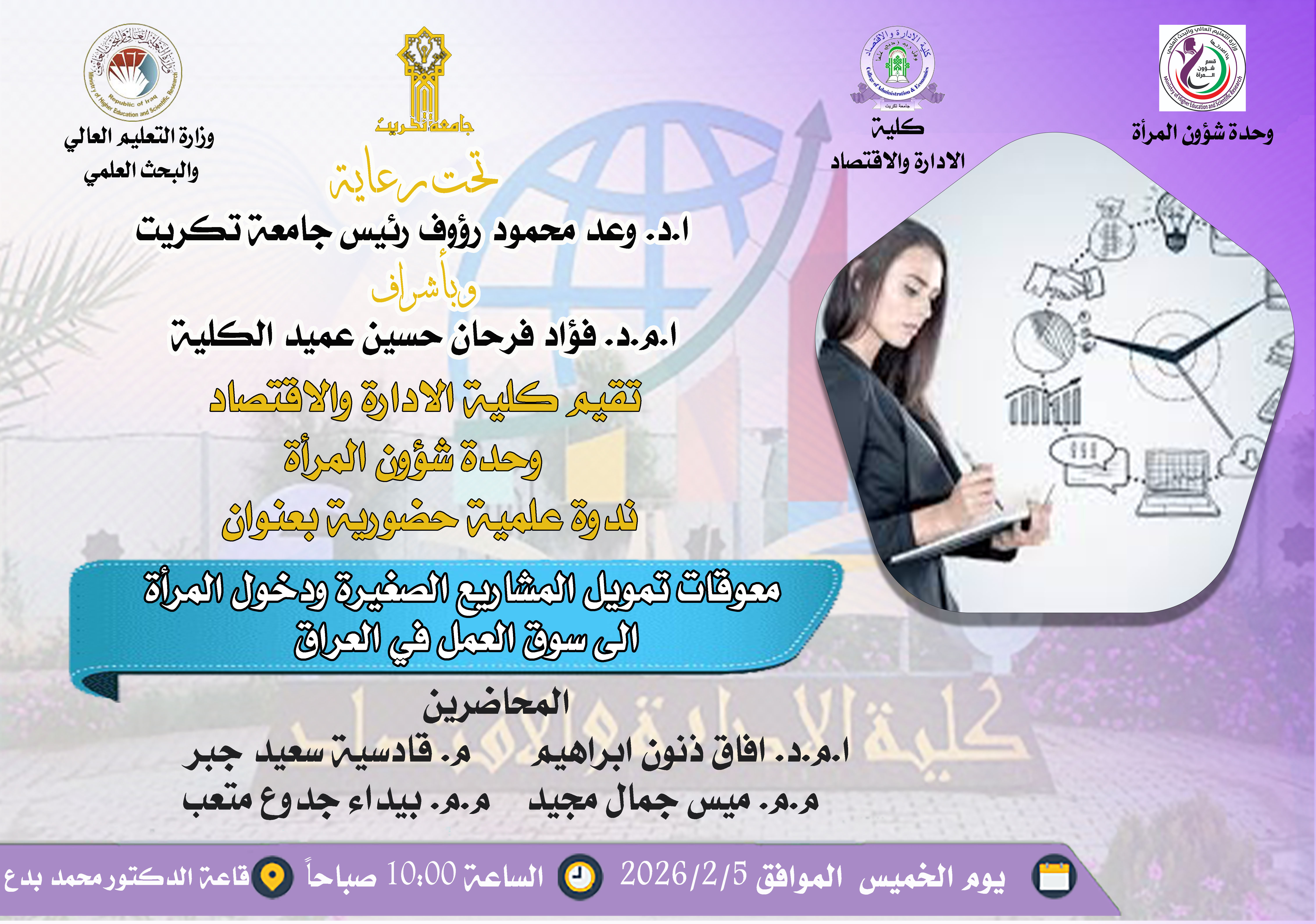 ستعقد بأذن الله تعالى ندوة علمية بعنوان معوقات تمويل المشاريع الصغيرة ودخول المرأة الى سوق العمل في العراق