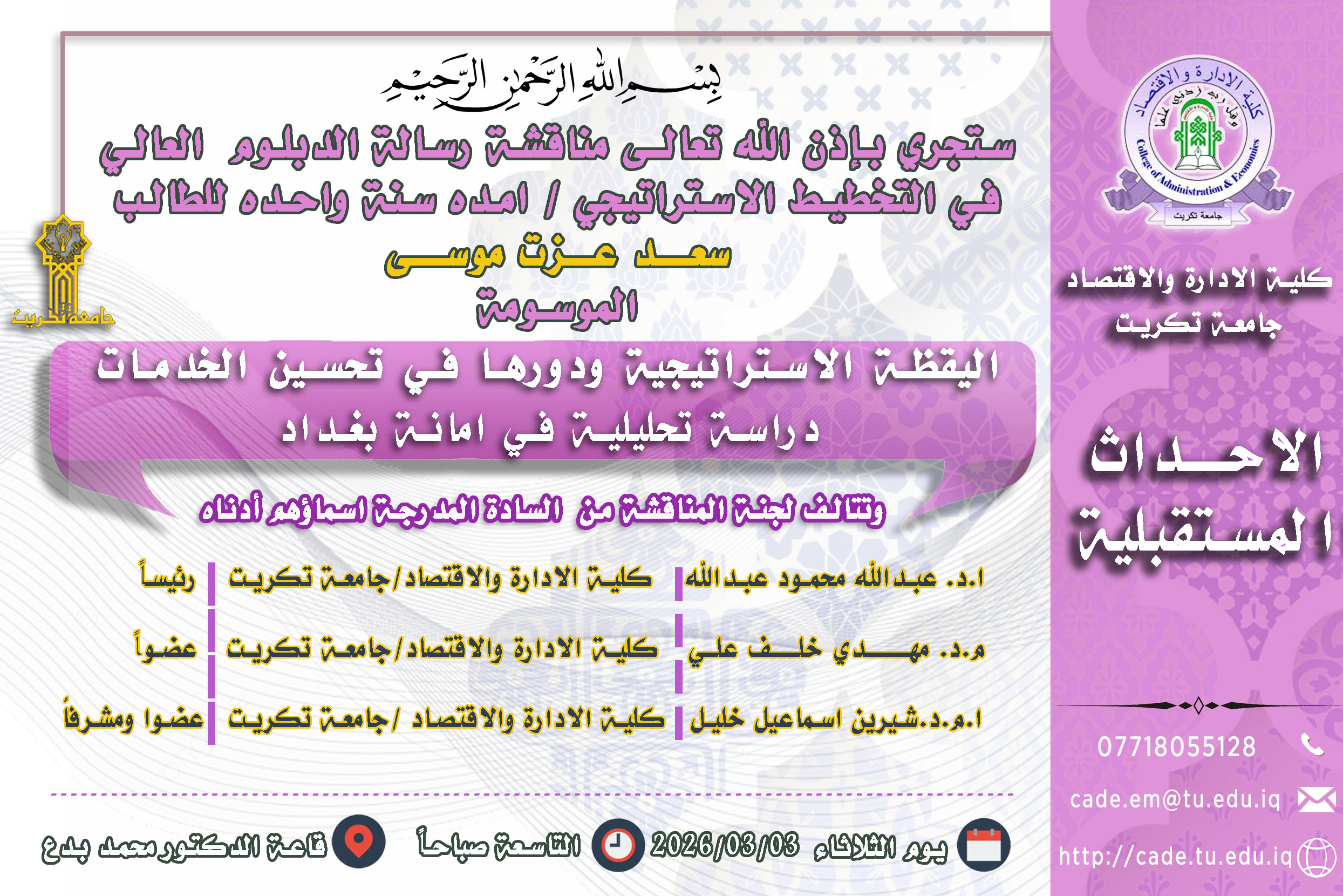 ستجري بإذن الله تعالـى مناقشة رسالة الدبلوم العالي في التخطيط الاستراتيجي / امده سنة واحده للطالب سعـــد عــزت موســـى