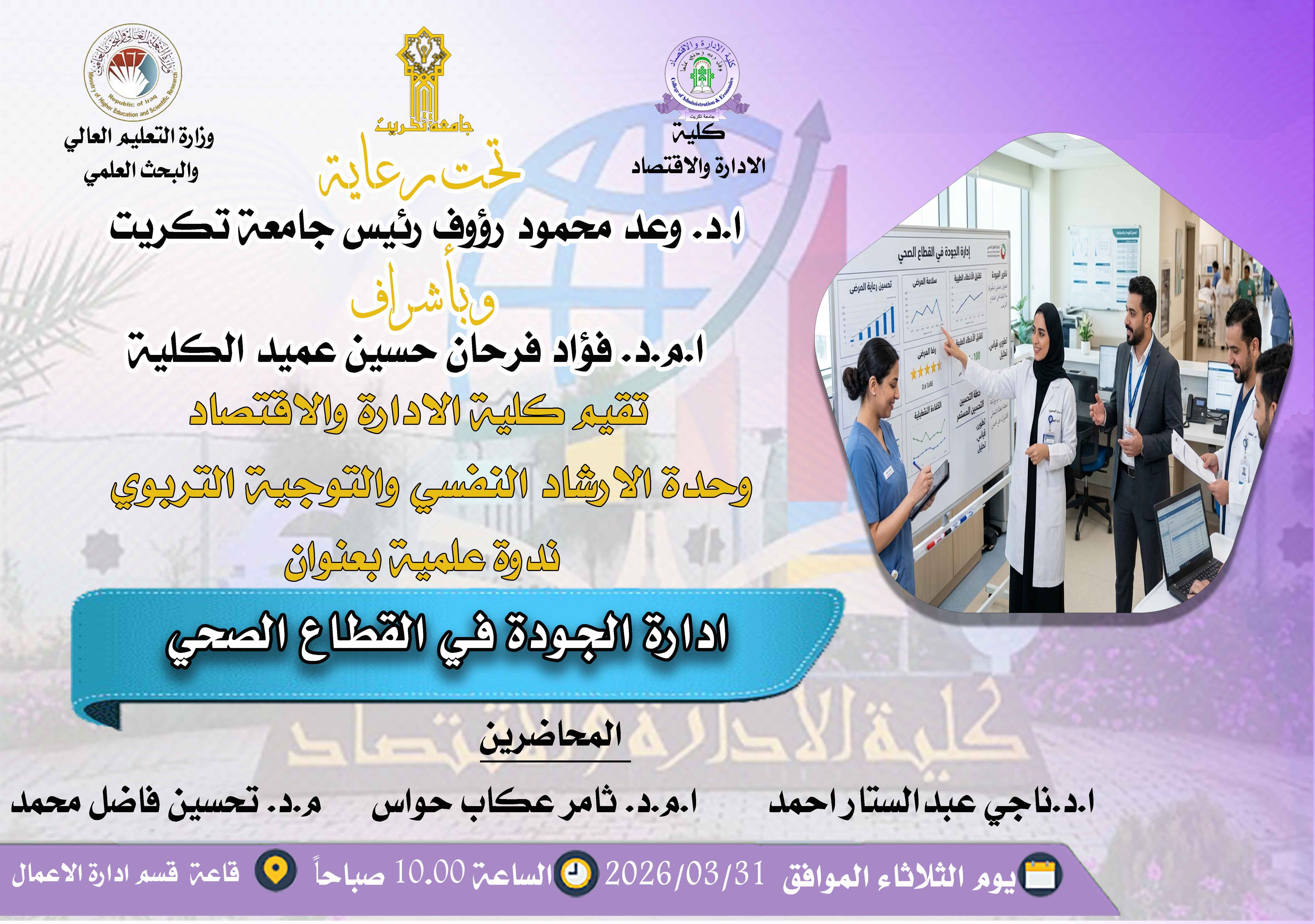 ستُقام بمشيئة الله تعالى يوم الثلاثاء الموافق 2026/3/31 ندوة علمية بعنوان: إدارة الجودة في القطاع الصحي
