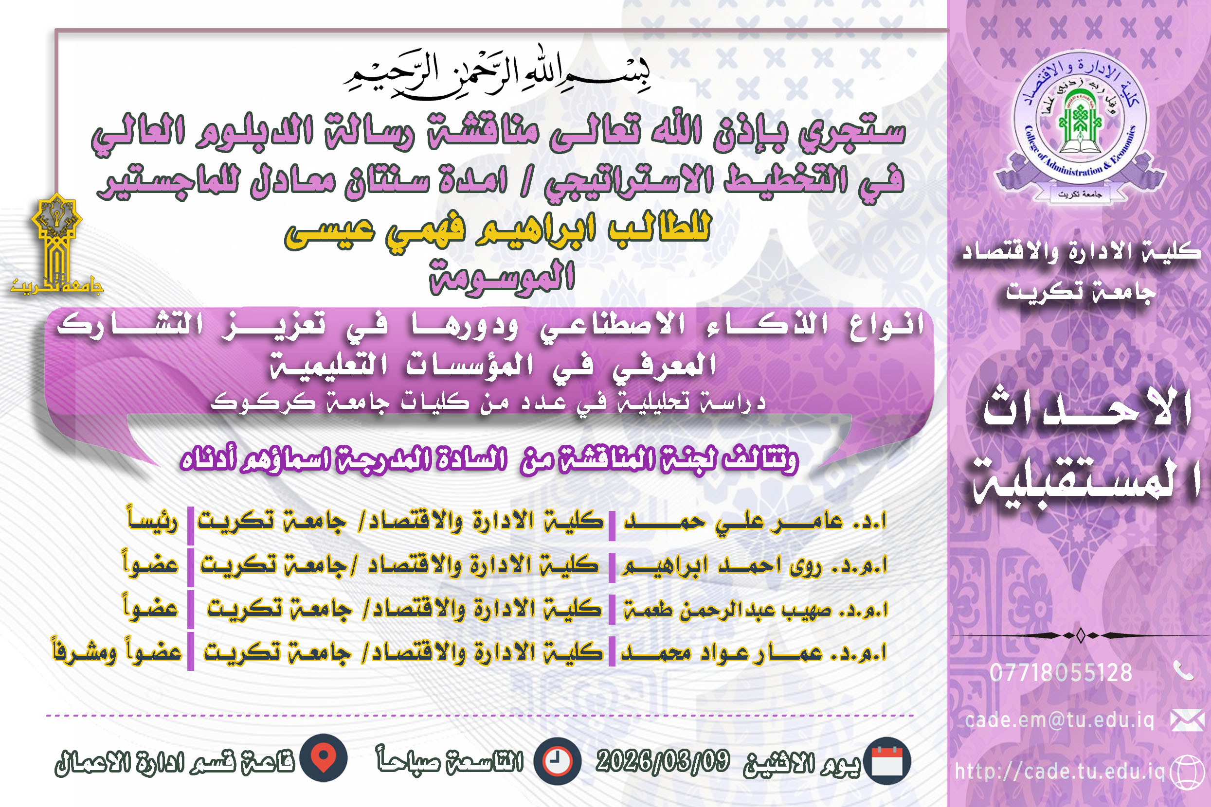 ستجري بإذن الله تعالـى مناقشة رسالة الدبلوم العالي في التخطيط الاستراتيجي / امدة سنتان معادل للماجستير للطالب ابراهيم فهمي عيسى