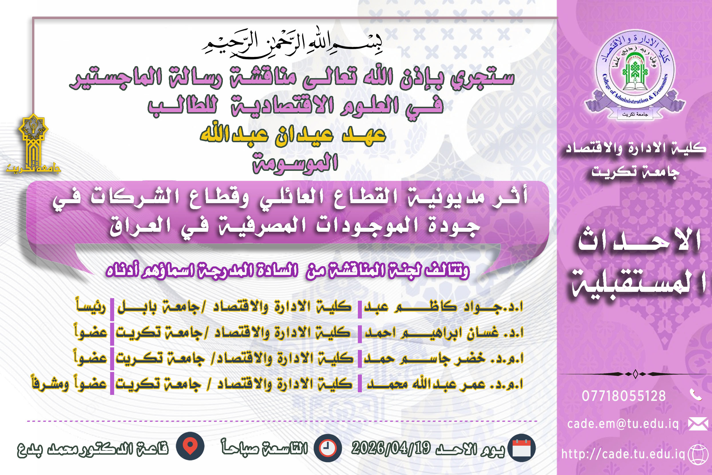 ستجري بإذن الله تعالـى مناقشة رسالة الماجستير فــي العلوم الاقتصادية للطالــب عهــد عيدان عبدالله