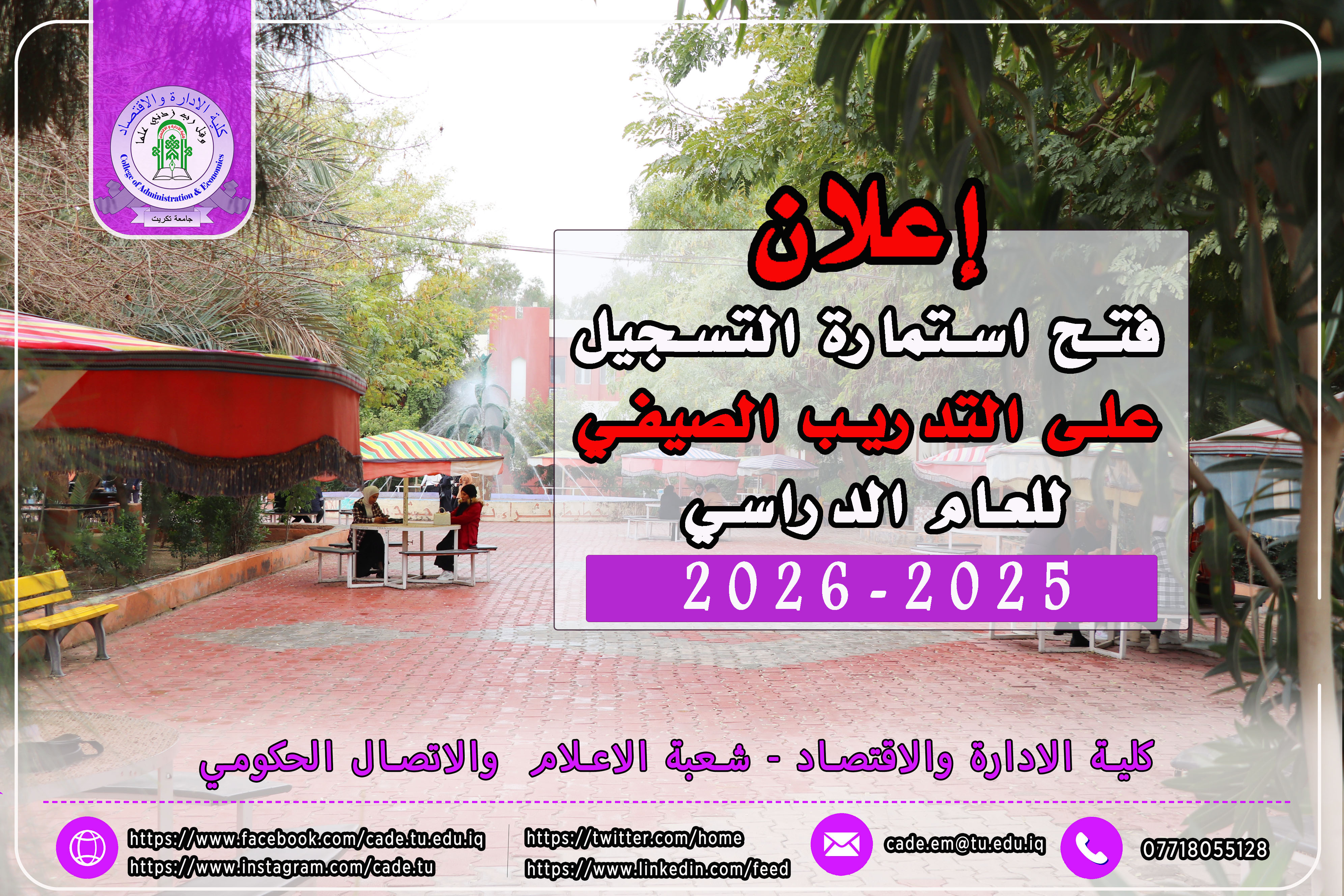 تُعلن عمادة كلية الإدارة والاقتصاد / جامعة تكريت عن فتح رابط استمارة التسجيل الخاصة بالتدريب الصيفي لطلبة المرحلة الثالثة في الدراستين الصباحية والمسائية، وذلك للعام الدراسي2026/2025 يأتي هذا الإعلان في إطار حرص الكلية على تمكين الطلبة من استيفاء متطلبات التدريب العملي، وتعزيز الجانب التطبيقي في مسيرتهم الأكاديمية.