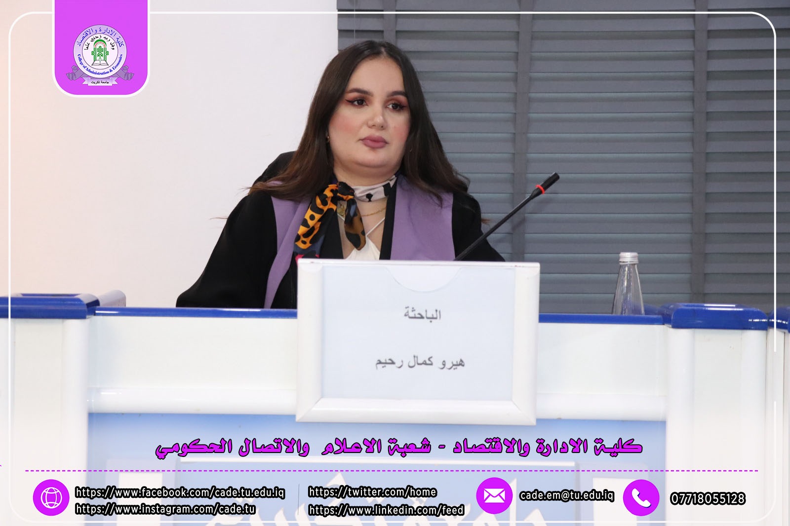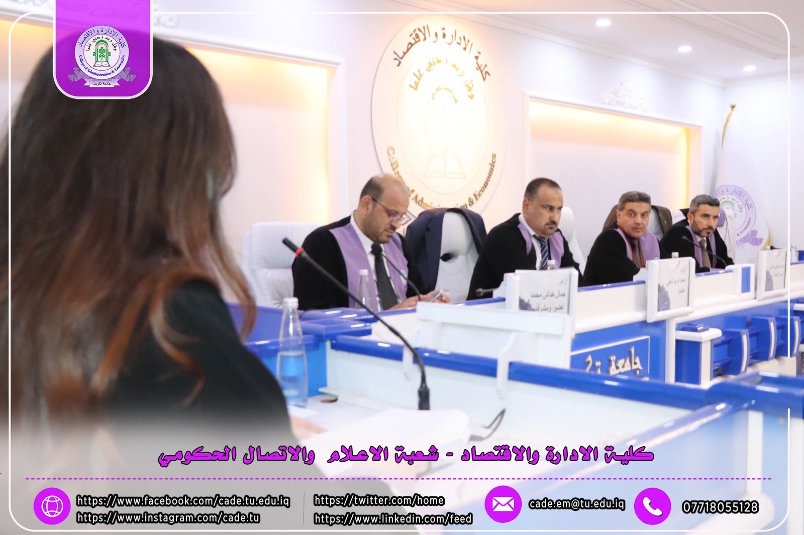 هذا وقد حضر المناقشة ا.م.د. فؤاد فرحان حسين عميد كلية الإدارة والاقتصاد و ا.م.د. خطاب عمران صالح معاون العميد للشؤون العلمية وم.د. احمد عايد مخلف معاون العميد للشؤون الإدارية وعدد من طلبة الدراسات العليا .