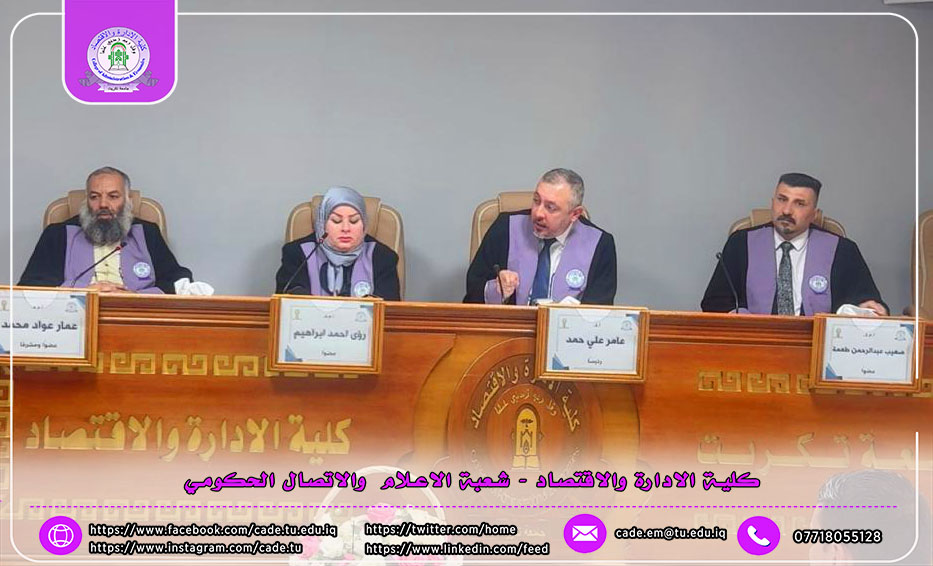 وتألفت لجنة المناقشة من أ.د. عامر علي حمد رئيساً وعضوية كل من أ.م.د رؤى أحمد إبراهيم، أ.م.د صهيب عبد الرحمن طعمة الى جانب المشرف على الرسالة