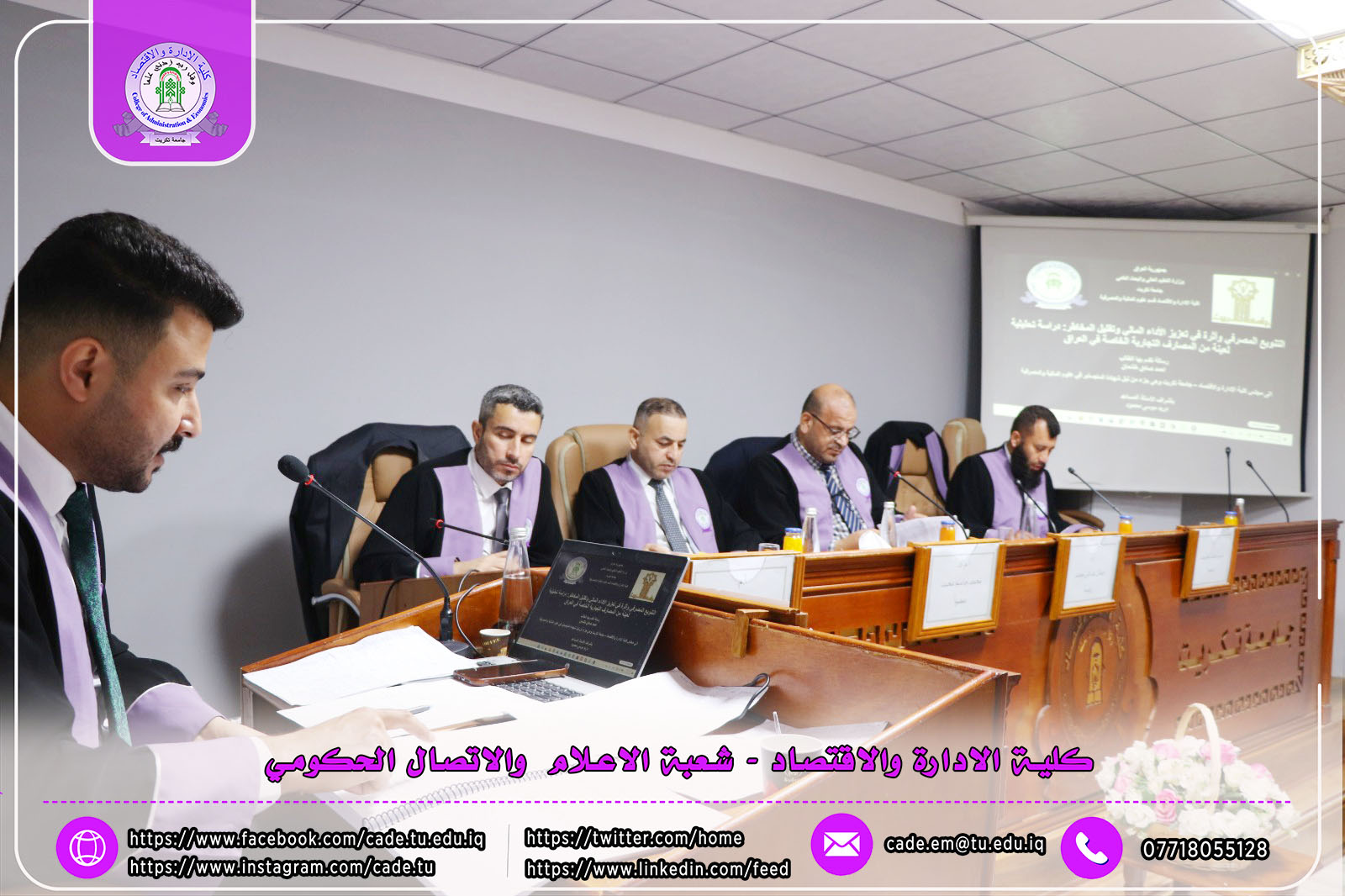 نوقشت في كلية الإدارة والاقتصاد / قسم العلوم المالية والمصرفية رسالة الماجستير في العلوم المالية والمصرفية للطالب احمد صادق خشمان والموسومة (التنويع المصرفي وأثره في تعزيز الأداء المالي وتقليل المخاطر: دراسة تحليلية لعينة من المصارف التجارية الخاصة في العراق) وذلك بإشراف ا.م. دريد موسى محمود.