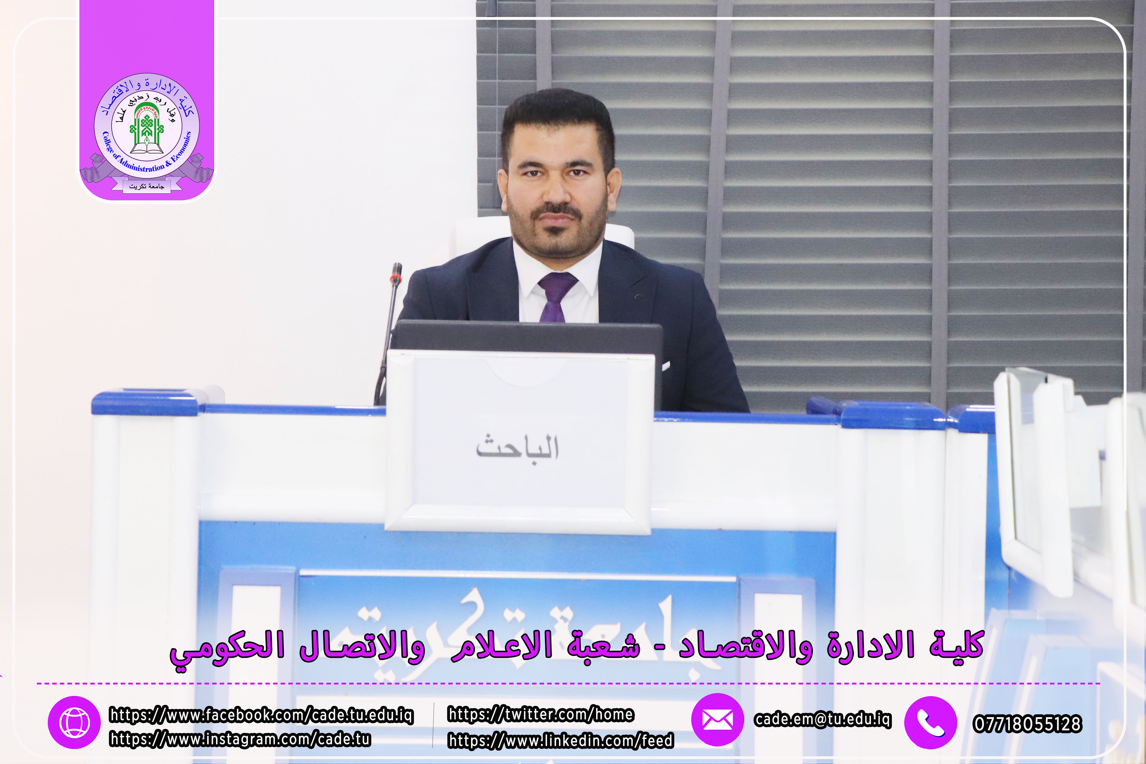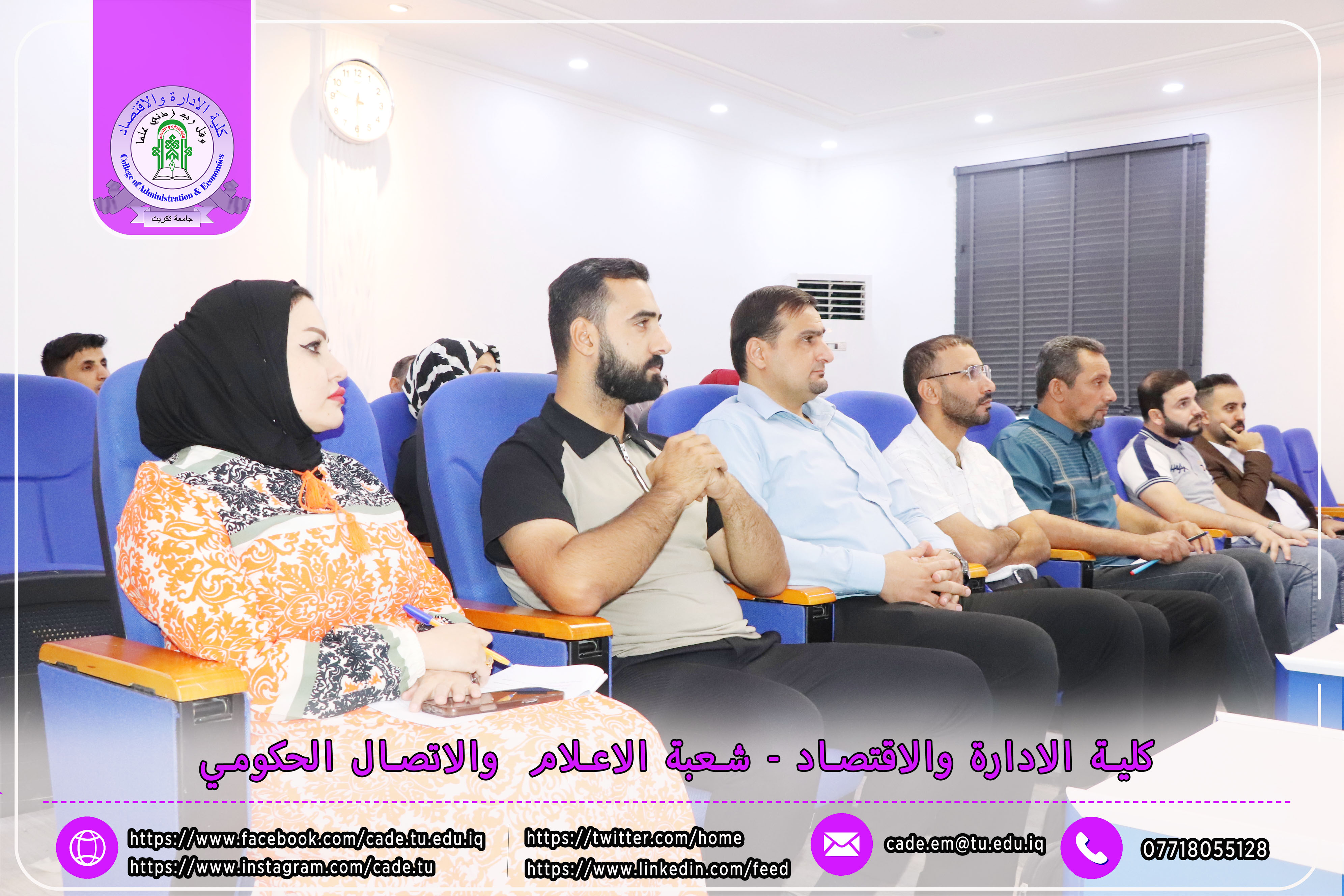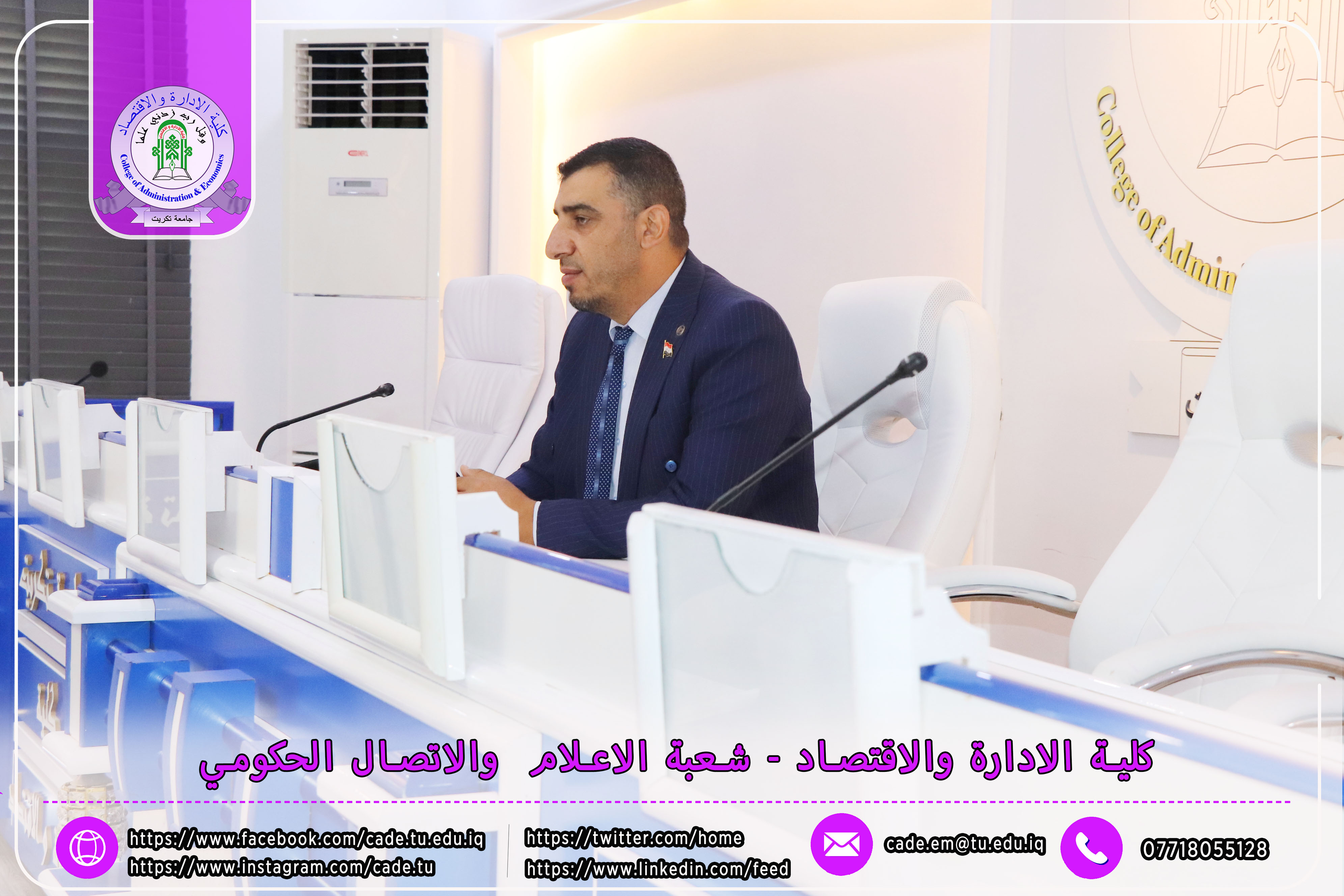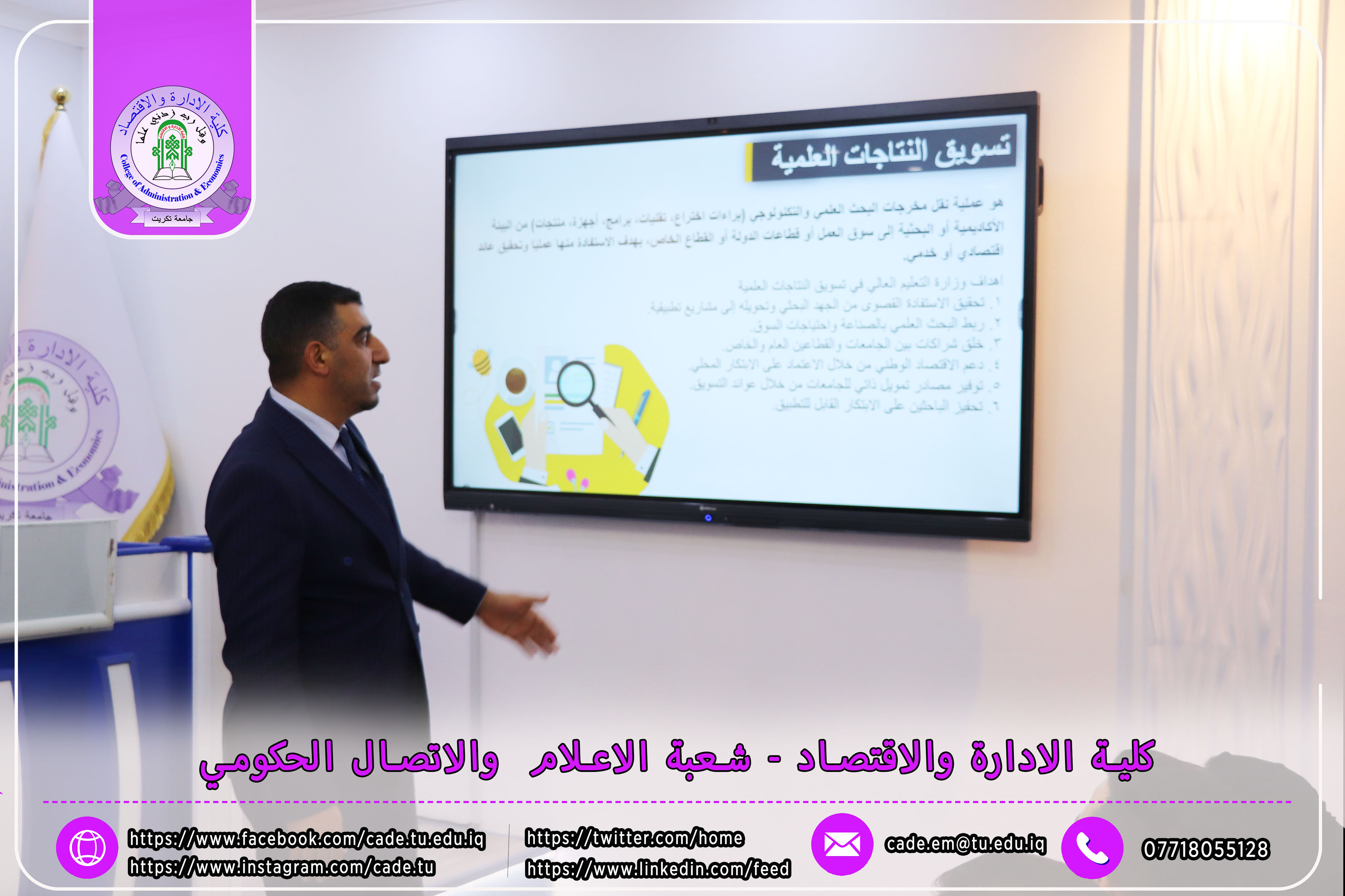 برعاية الأستاذ الدكتور وعد محمود رؤوف، رئيس جامعة تكريت، وبإشراف الأستاذ المساعد الدكتور فؤاد فرحان حسين، عميد كلية الإدارة والاقتصاد، نظّمت كلية الإدارة والاقتصاد بالتعاون مع قسم الشؤون العلمية في رئاسة الجامعة، ندوةً علميةً بعنوان "آلية تسويق النتاجات العلمية"، وذلك يوم الأحد الموافق 19 / 10 / 2025، في تمام الساعة العاشرة صباحًا على قاعة الدكتور محمد بدع.