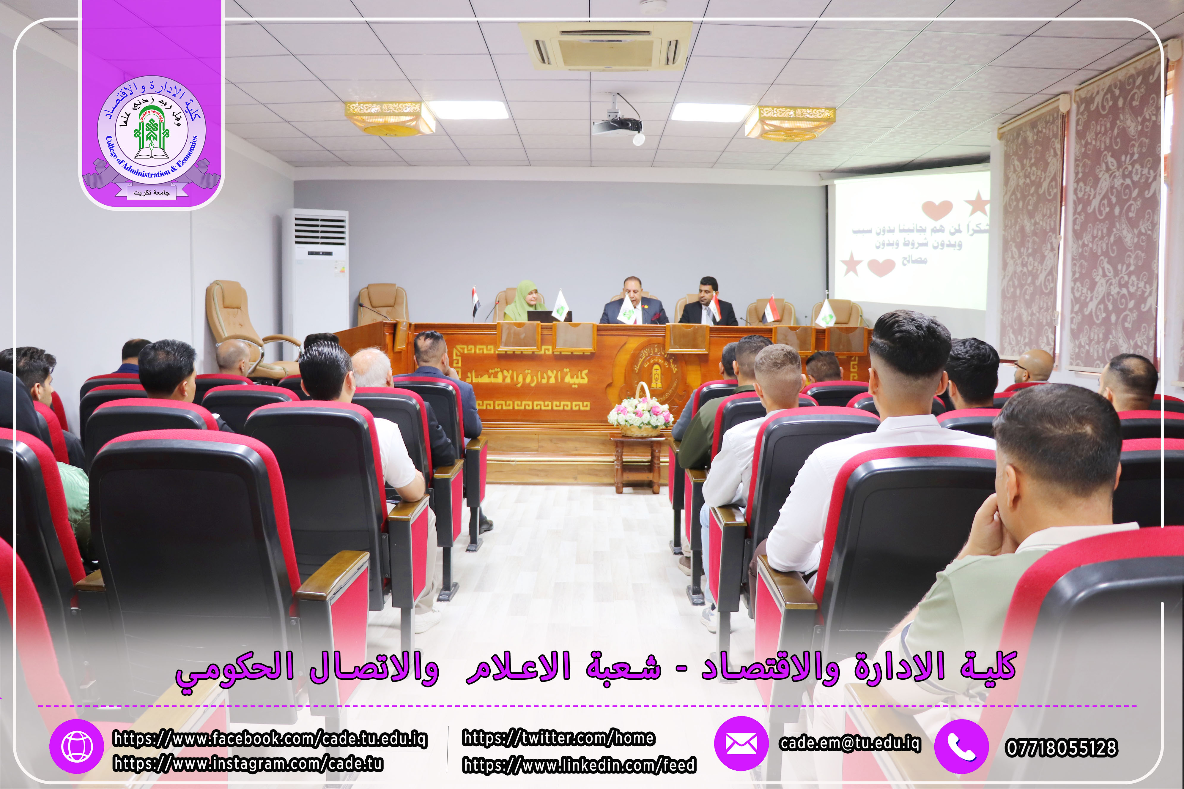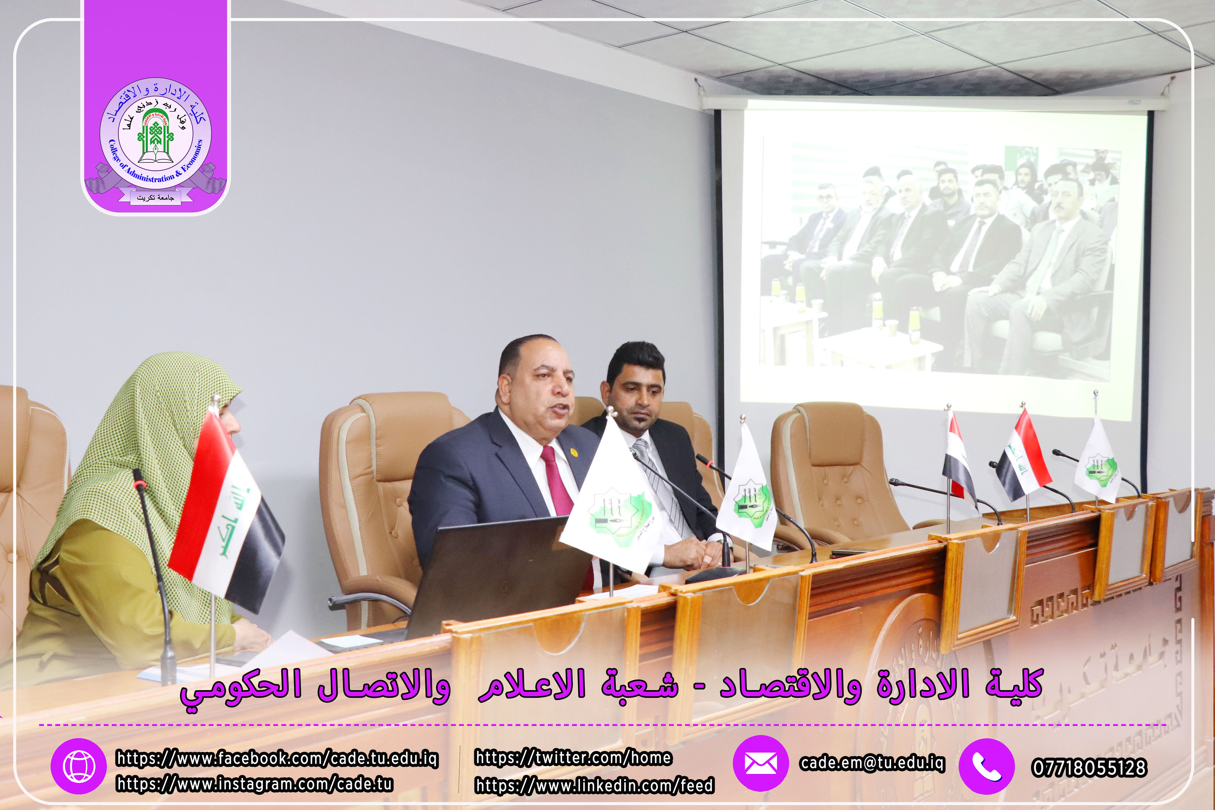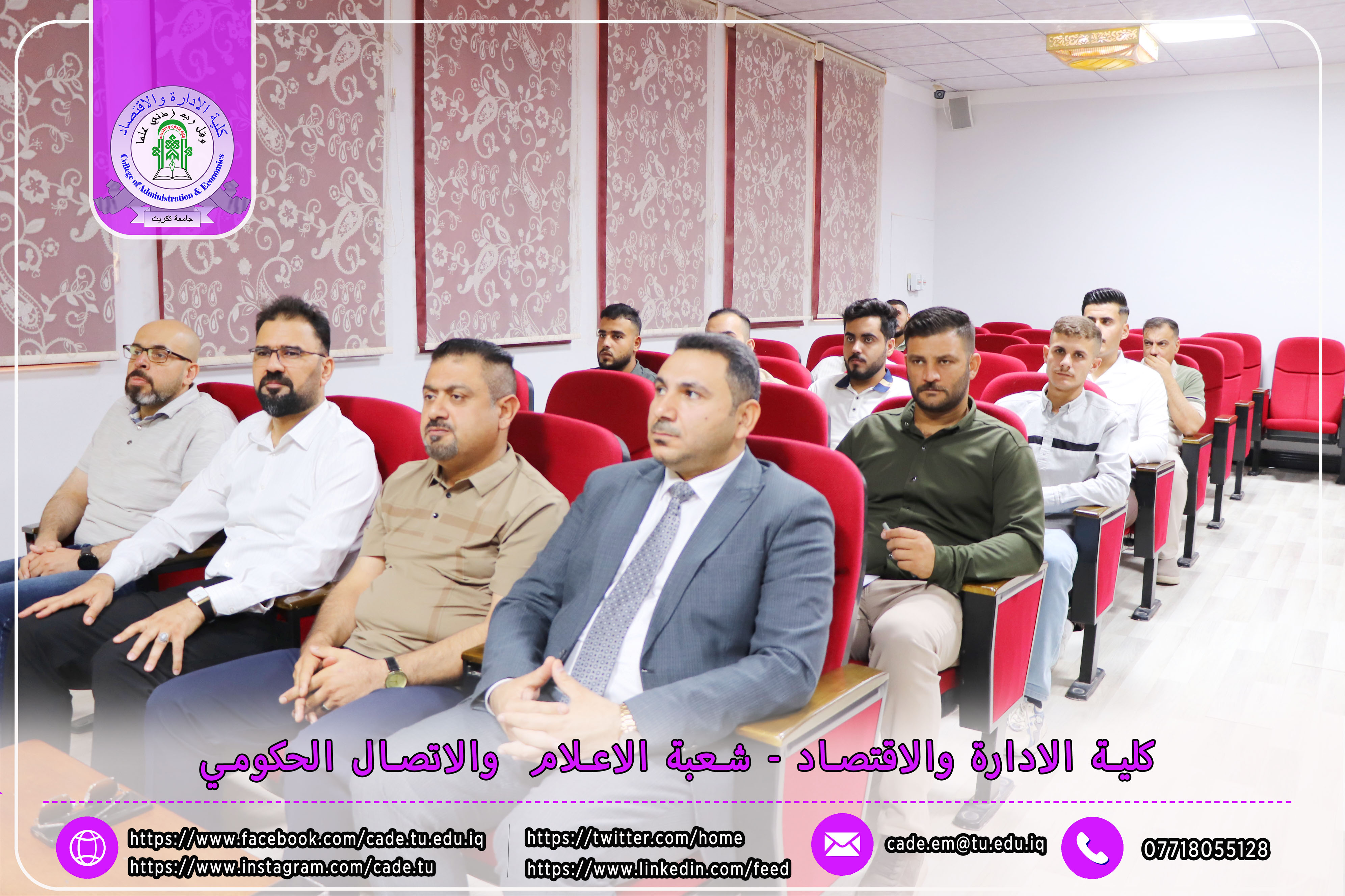 برعاية الأستاذ الدكتور وعد محمود رؤوف رئيس جامعة تكريت المحترم والأستاذ المساعد الدكتور علي مسير ياسين نقيب الأكاديميين العراقيين المحترم وبأشراف كل من ا.د محمد عطية زبار رئيس نقابة الأكاديميين العراقيين / فرع صلاح الدين المحترم و أ.م.د فؤاد فرحان حسين عميد كلية الإدارة والاقتصاد المحترم و أ.م.د سياف عبد حسين مدير مركز التعليم المستمر المحترم، ورشة عمل تدريبية توعوية بعنوان ( كيفية ملء الاستمارة الإلكترونية للانتساب وآلية الدفع الإلكتروني لأجور الهوية النقابية)، وذلك يوم الاثنين الموافق 20 / 10 / 2025، في تمام الساعة العاشرة صباحًا على قاعة قسم إدارة الأعمال.