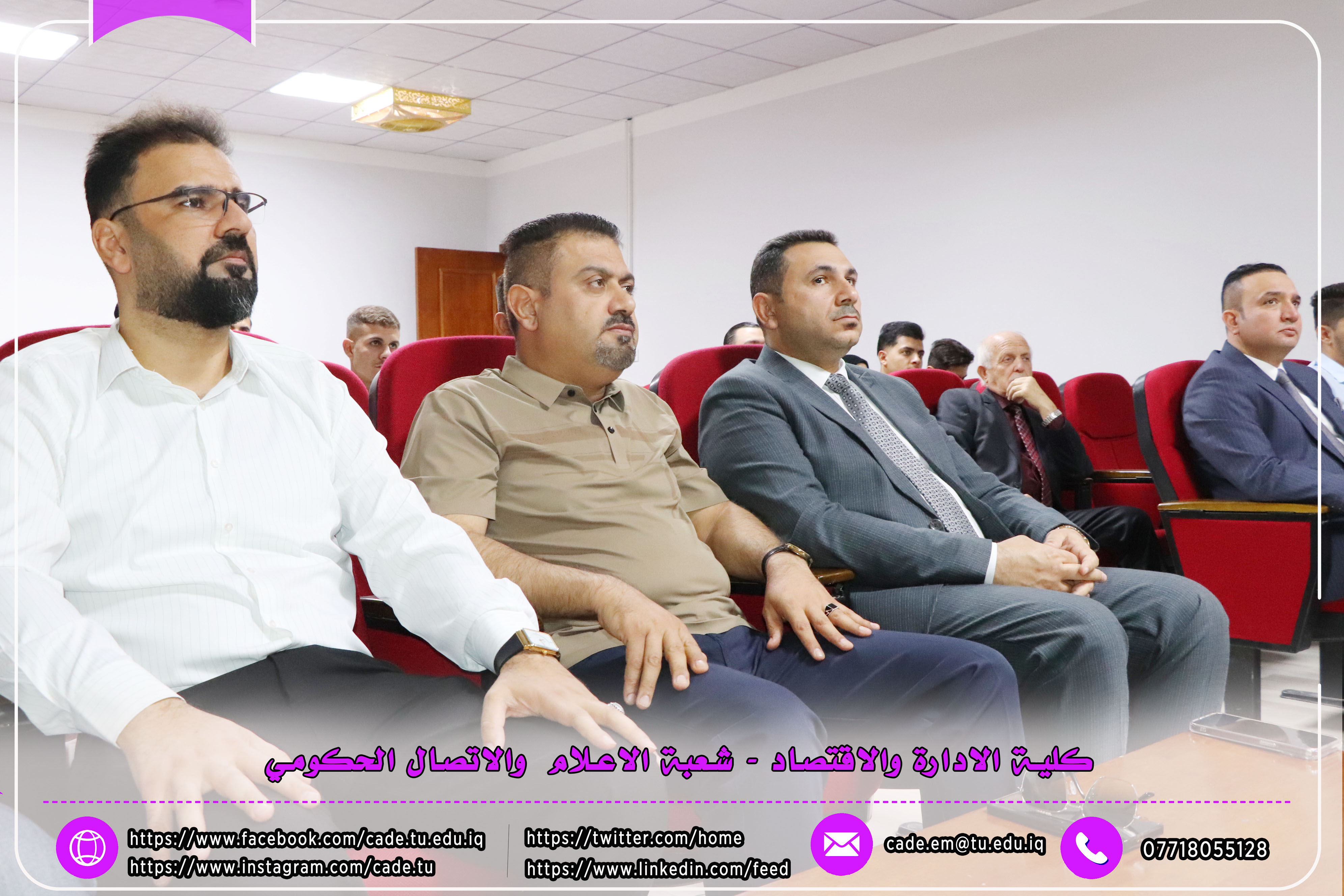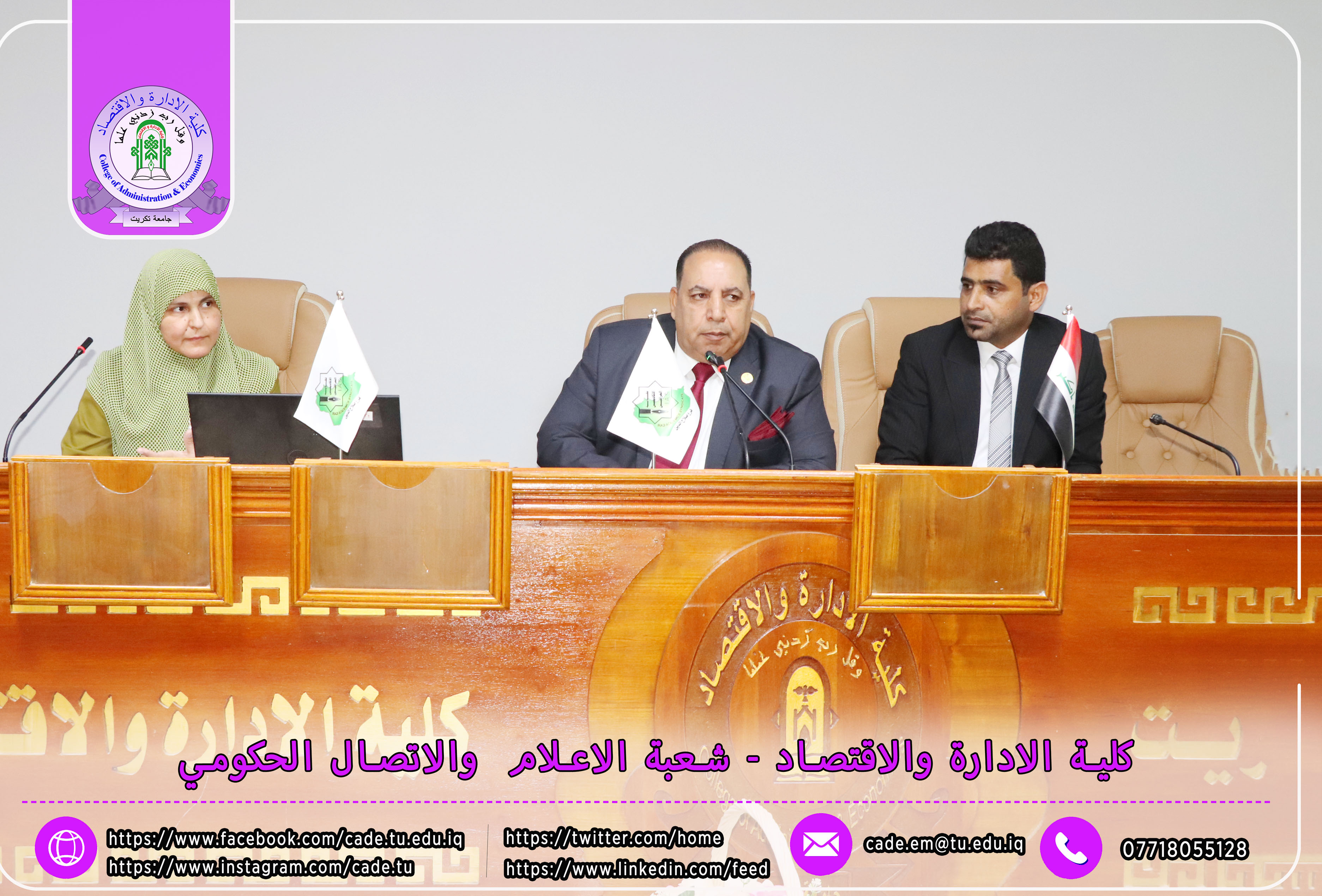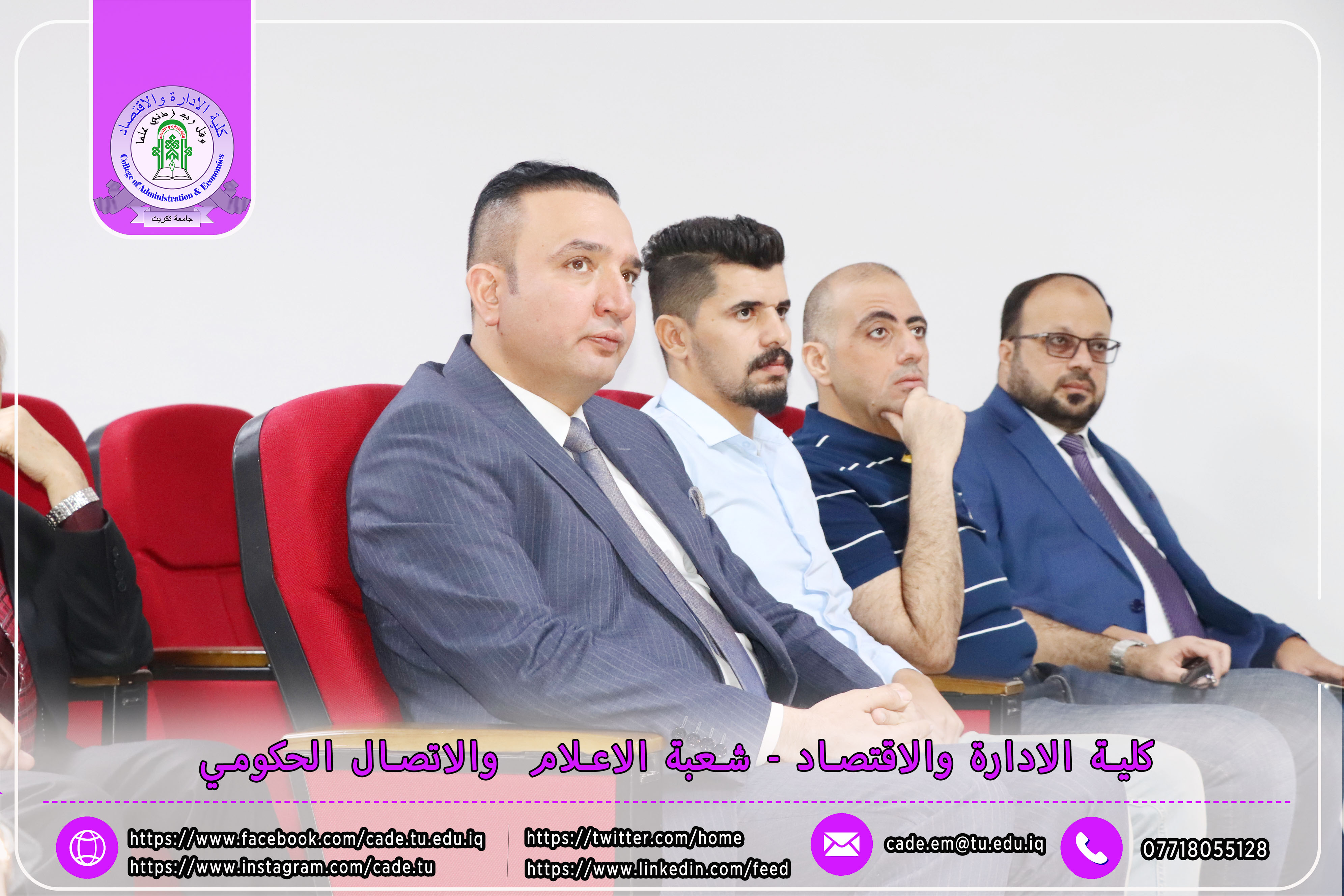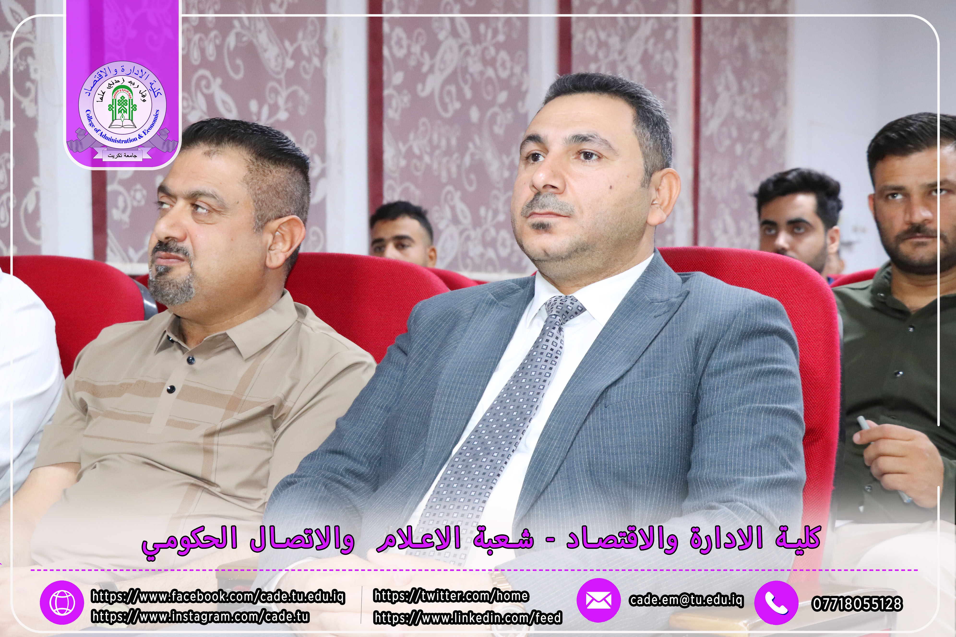 برعاية الأستاذ الدكتور وعد محمود رؤوف رئيس جامعة تكريت المحترم والأستاذ المساعد الدكتور علي مسير ياسين نقيب الأكاديميين العراقيين المحترم وبأشراف كل من ا.د محمد عطية زبار رئيس نقابة الأكاديميين العراقيين / فرع صلاح الدين المحترم و أ.م.د فؤاد فرحان حسين عميد كلية الإدارة والاقتصاد المحترم و أ.م.د سياف عبد حسين مدير مركز التعليم المستمر المحترم، ورشة عمل تدريبية توعوية بعنوان ( كيفية ملء الاستمارة الإلكترونية للانتساب وآلية الدفع الإلكتروني لأجور الهوية النقابية)، وذلك يوم الاثنين الموافق 20 / 10 / 2025، في تمام الساعة العاشرة صباحًا على قاعة قسم إدارة الأعمال.