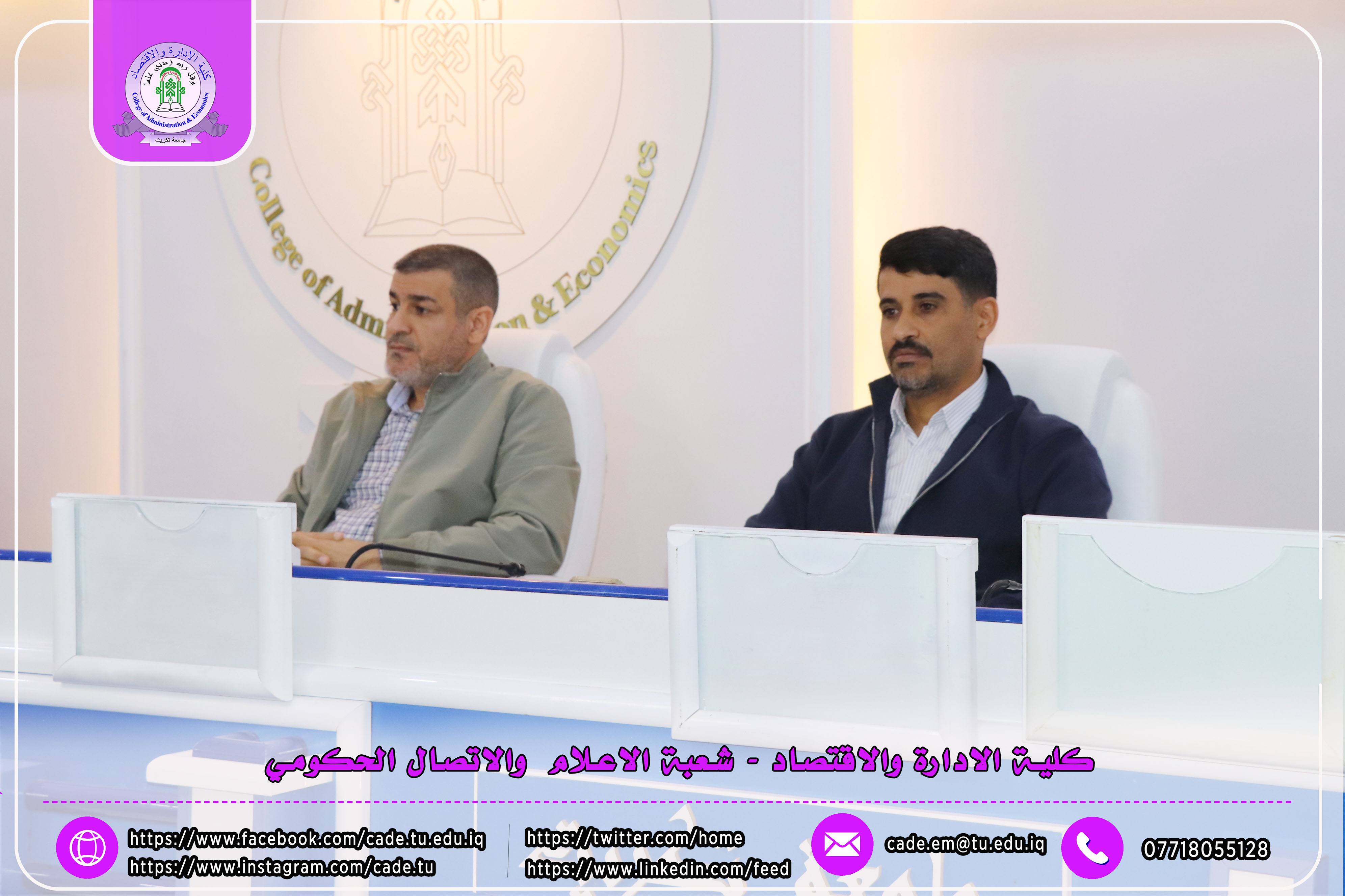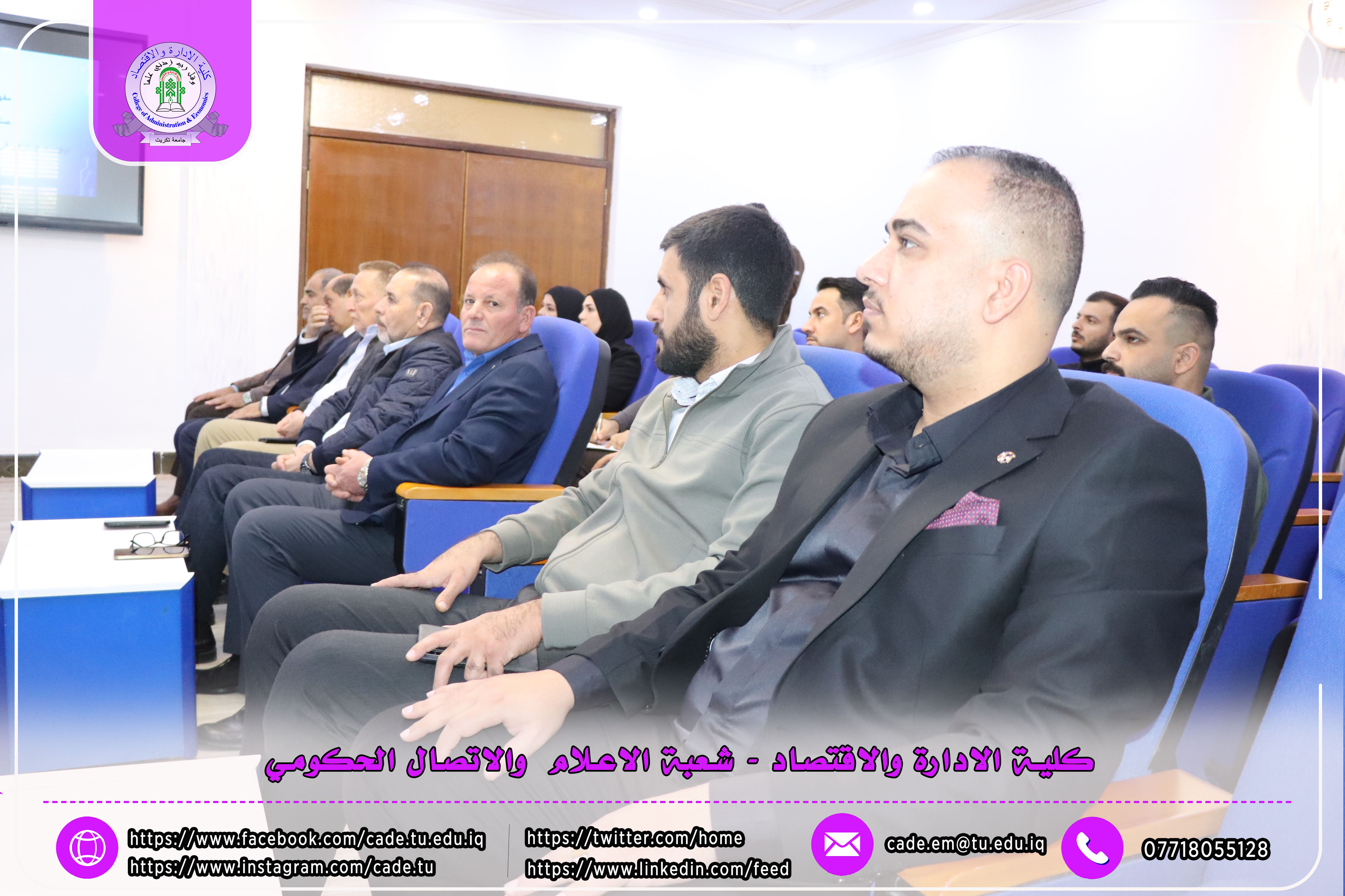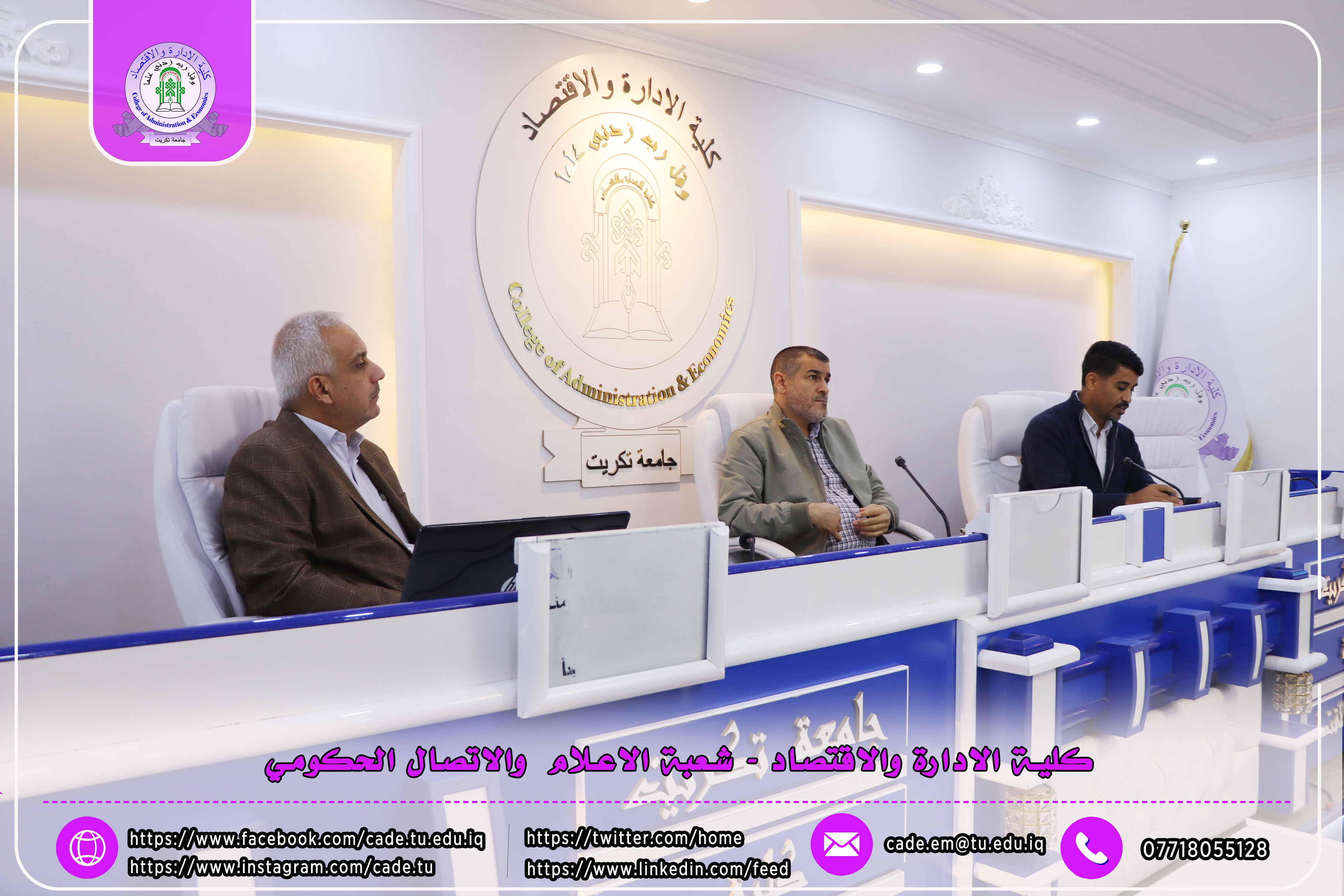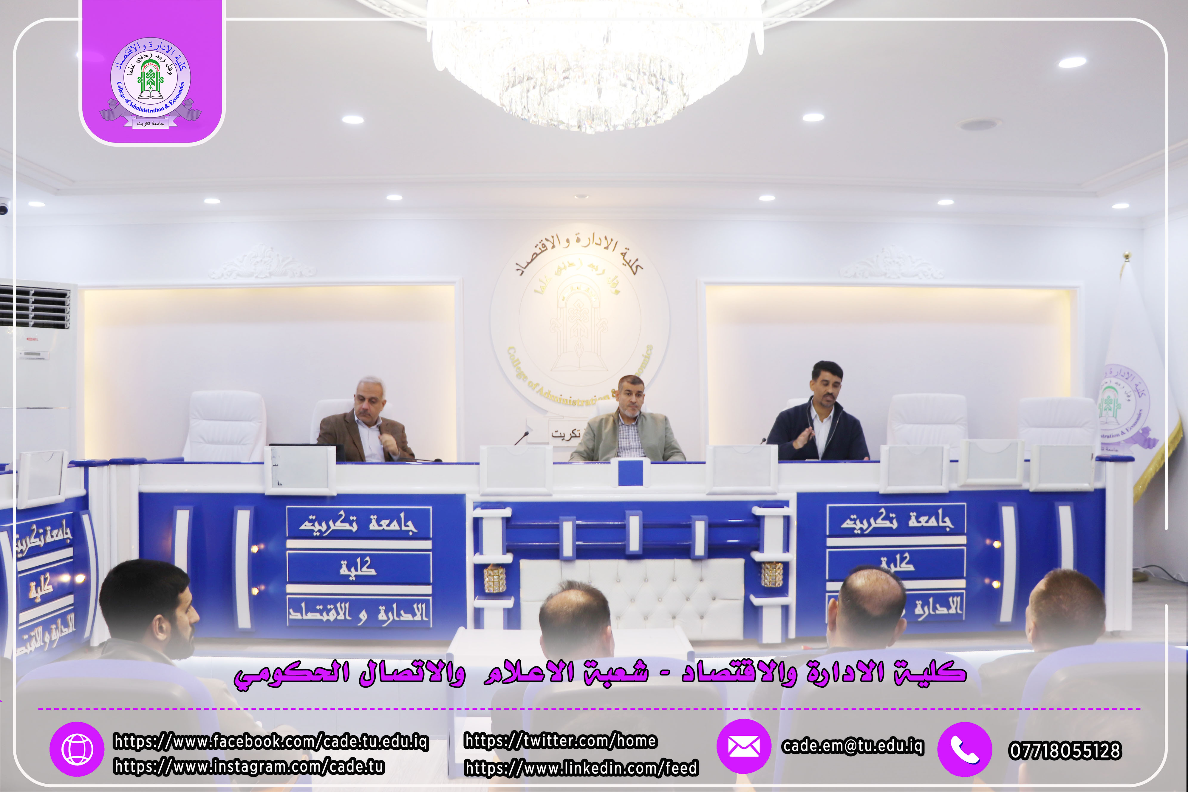 برعاية الأستاذ الدكتور وعد محمود رؤوف رئيس جامعة تكريت، وبإشراف كلٍّ من الأستاذ المساعد الدكتور فؤاد فرحان حسين عميد كلية الإدارة والاقتصاد، والأستاذ المساعد الدكتور سياف عبد حسين مدير مركز التعليم المستمر، نظّمت عمادة الكلية وبالتعاون مع مركز التعليم المستمر أعمال دورة علمية حضورية بعنوان ( الاقتصاد السلوكي وصناعة السياسات العامة في العصر الرقمي )، وذلك يوم الأربعاء الموافق 4/12/2025، في تمام الساعة العاشرة صباحاً، على قاعة الدكتور محمد بدع.