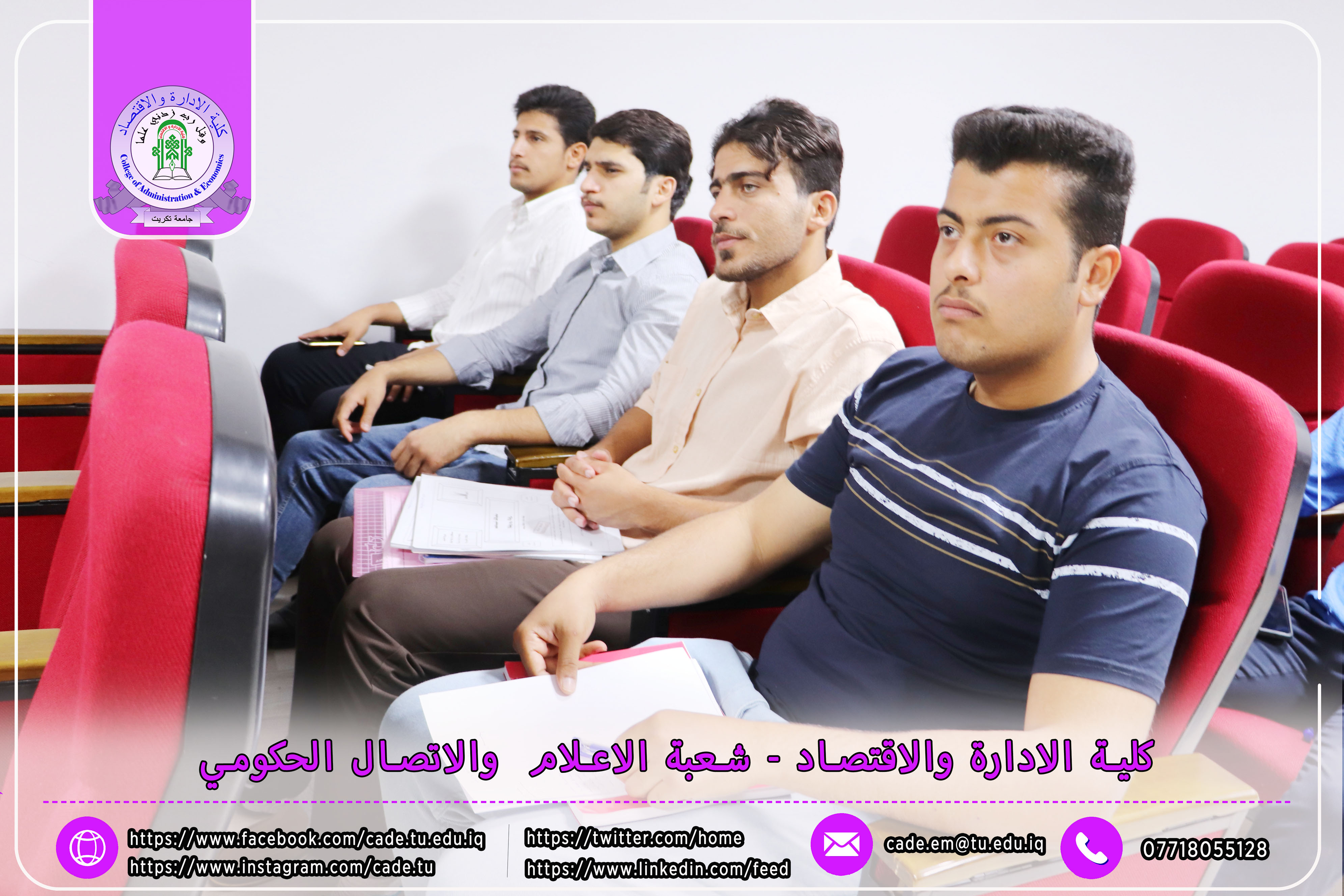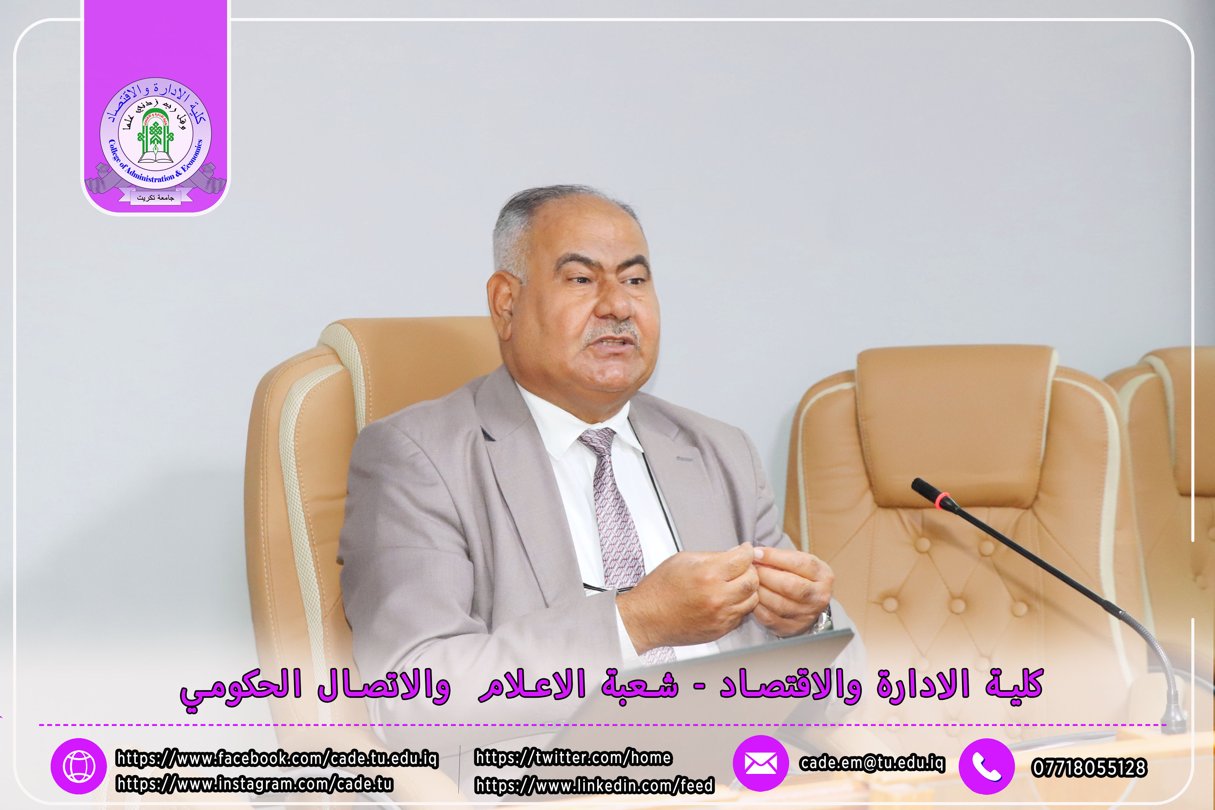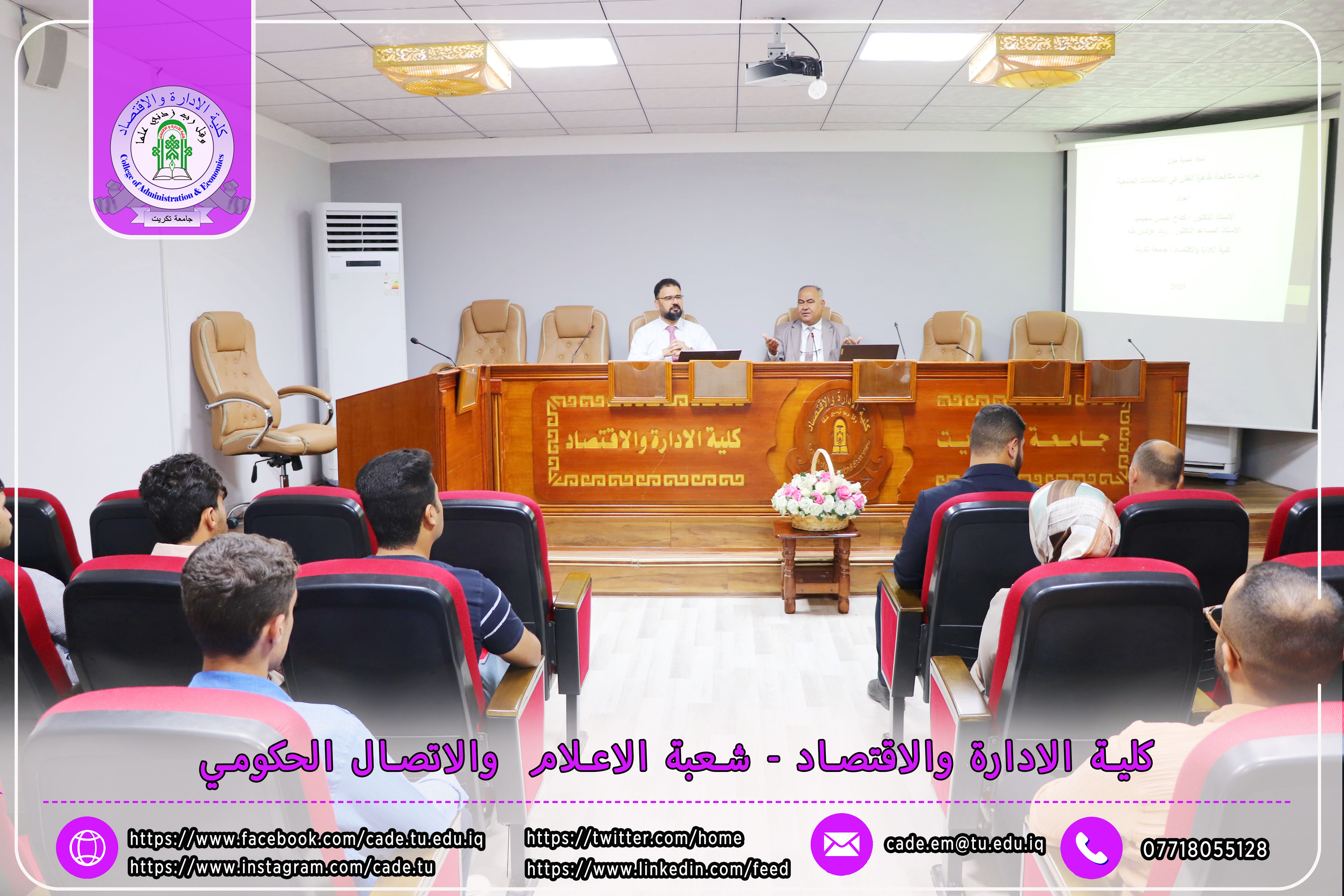 برعاية الأستاذ الدكتور وعد محمود رؤوف، رئيس جامعة تكريت، وبإشراف الأستاذ المساعد الدكتور فؤاد فرحان حسين، عميد كلية الإدارة والاقتصاد، نظّمت وحدة الإرشاد النفسي والتوجيه التربوي في الكلية ندوةً علميةً بعنوان "إجراءات مكافحة ظاهرة الغش في الامتحانات الجامعية"، وذلك يوم الثلاثاء الموافق 2025/10/21 في تمام الساعة العاشرة صباحًا على قاعة قسم إدارة الأعمال.