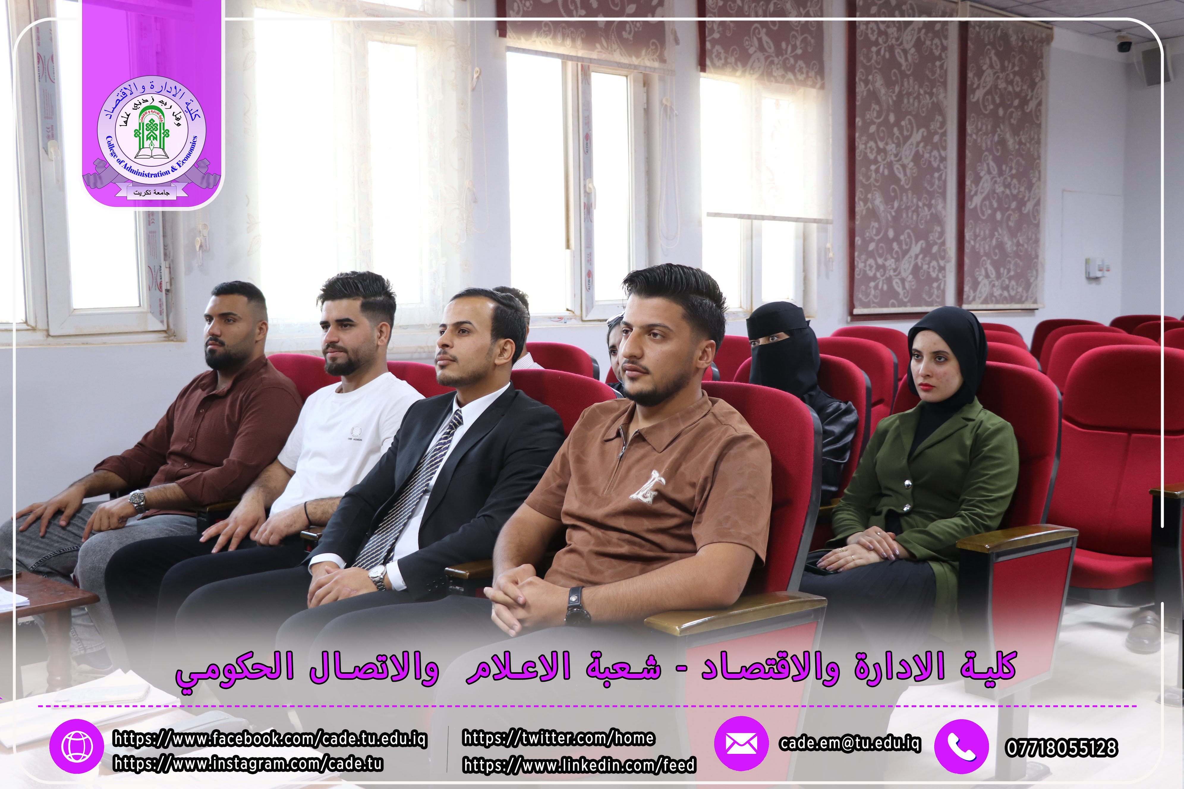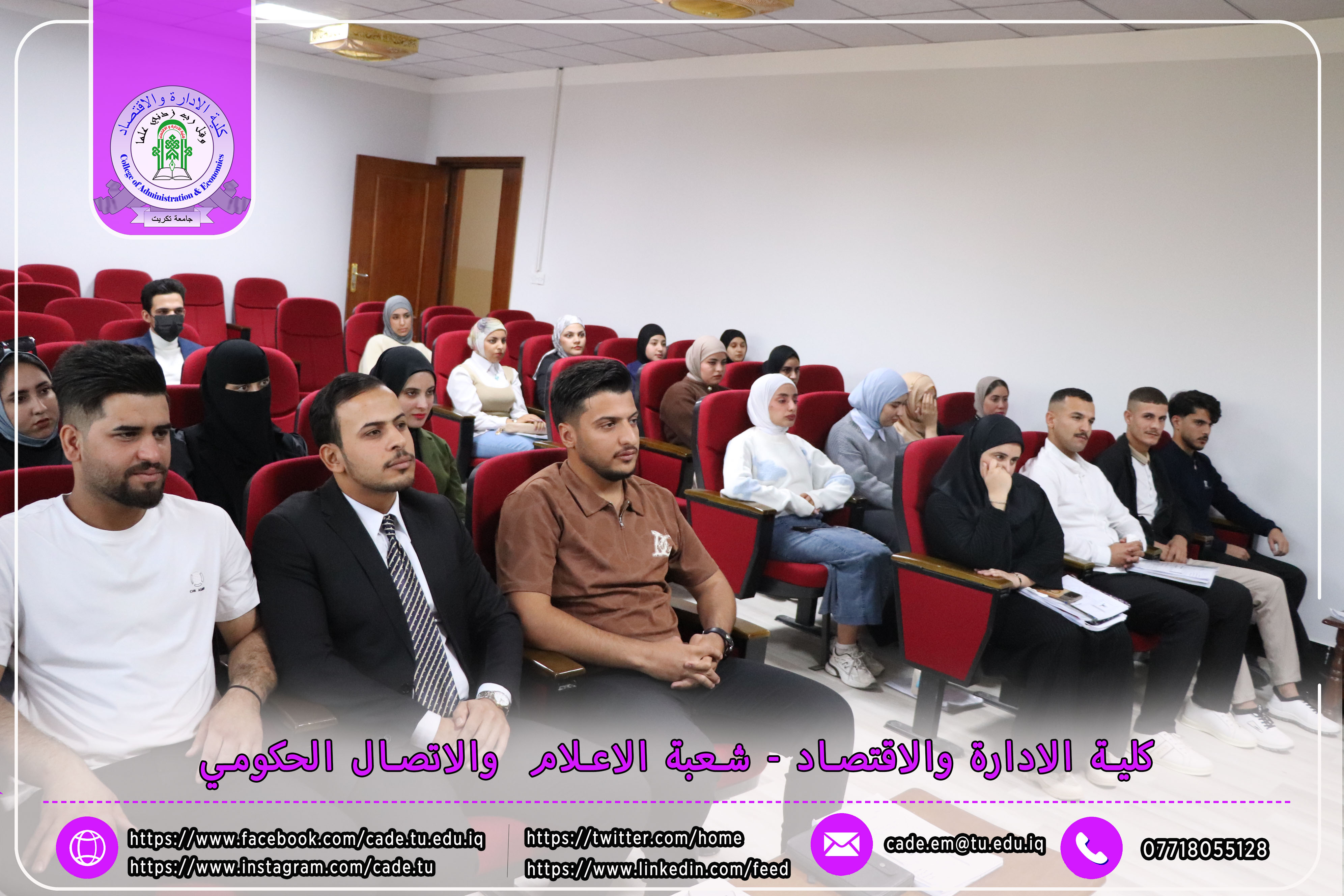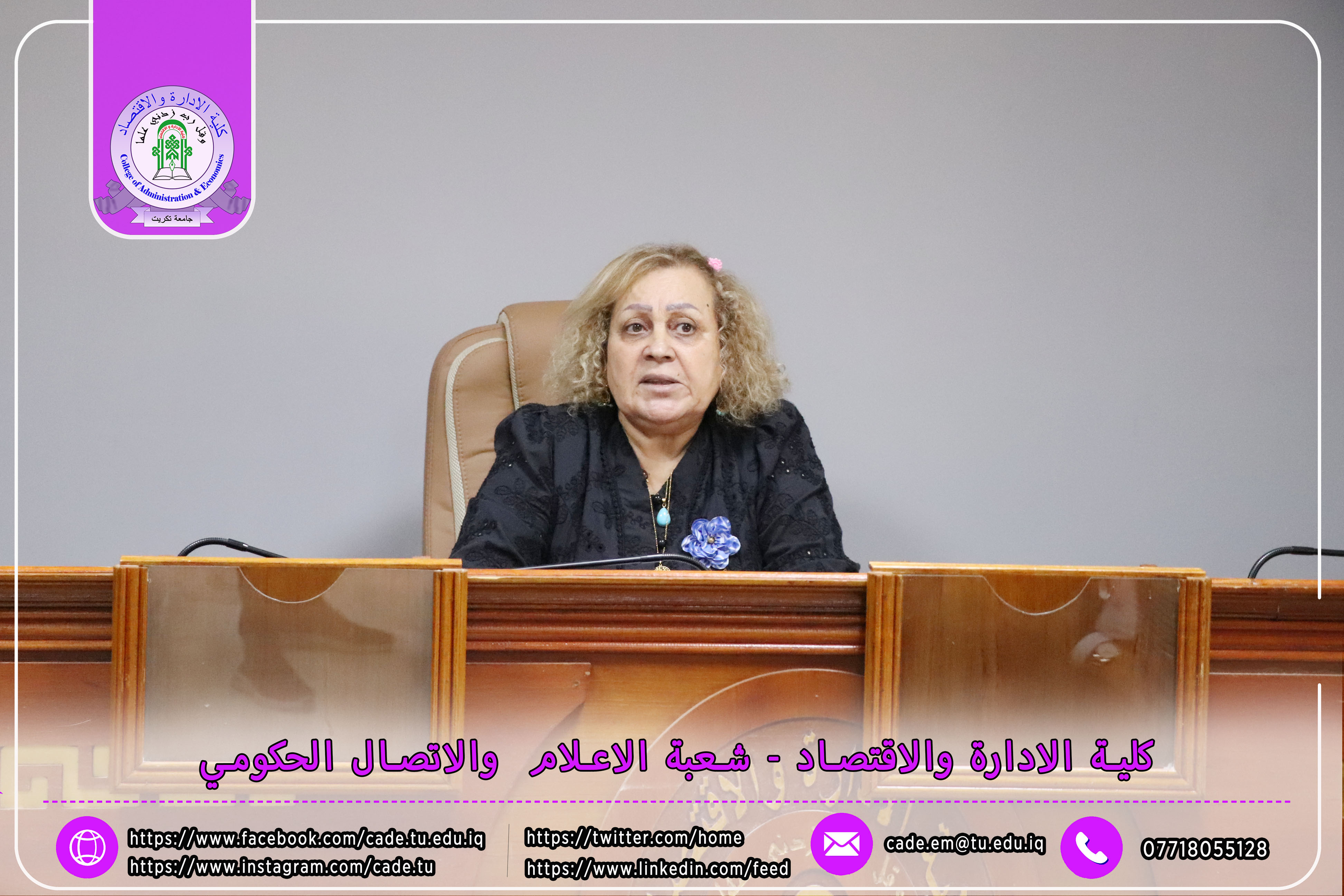 برعاية الأستاذ الدكتور وعد محمود رؤوف رئيس جامعة تكريت، وبإشراف الأستاذ المساعد الدكتور فؤاد فرحان حسين عميد كلية الإدارة والاقتصاد، اقامت وحدة شؤون المرأة في الكلية ندوة علمية حضورية بعنوان "المرأة والقيادة في المنظمات"، وذلك يوم الثلاثاء الموافق 18/2/2025 على قاعة قسم إدارة الأعمال.