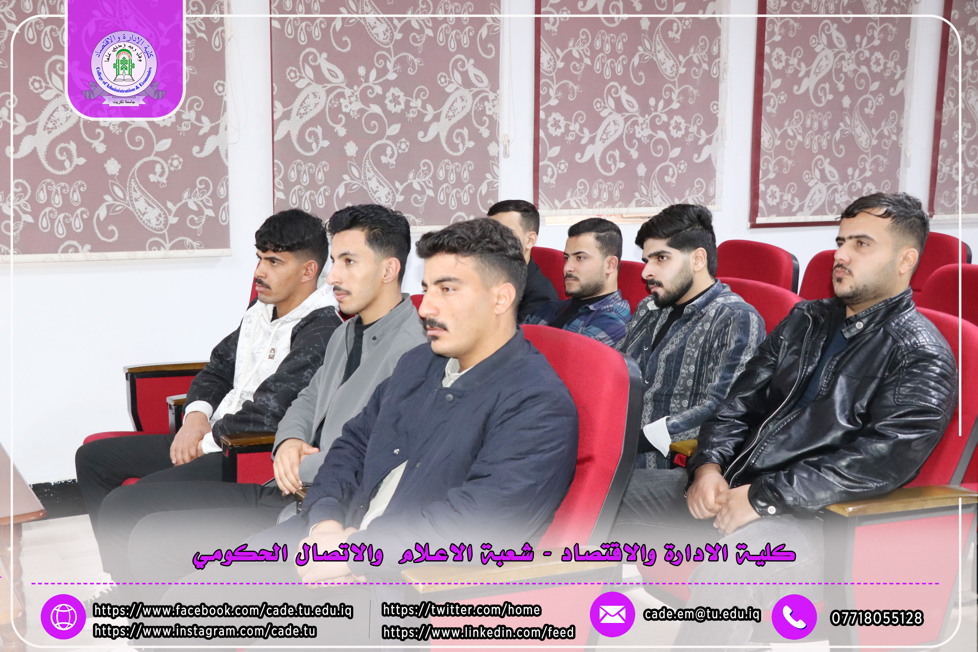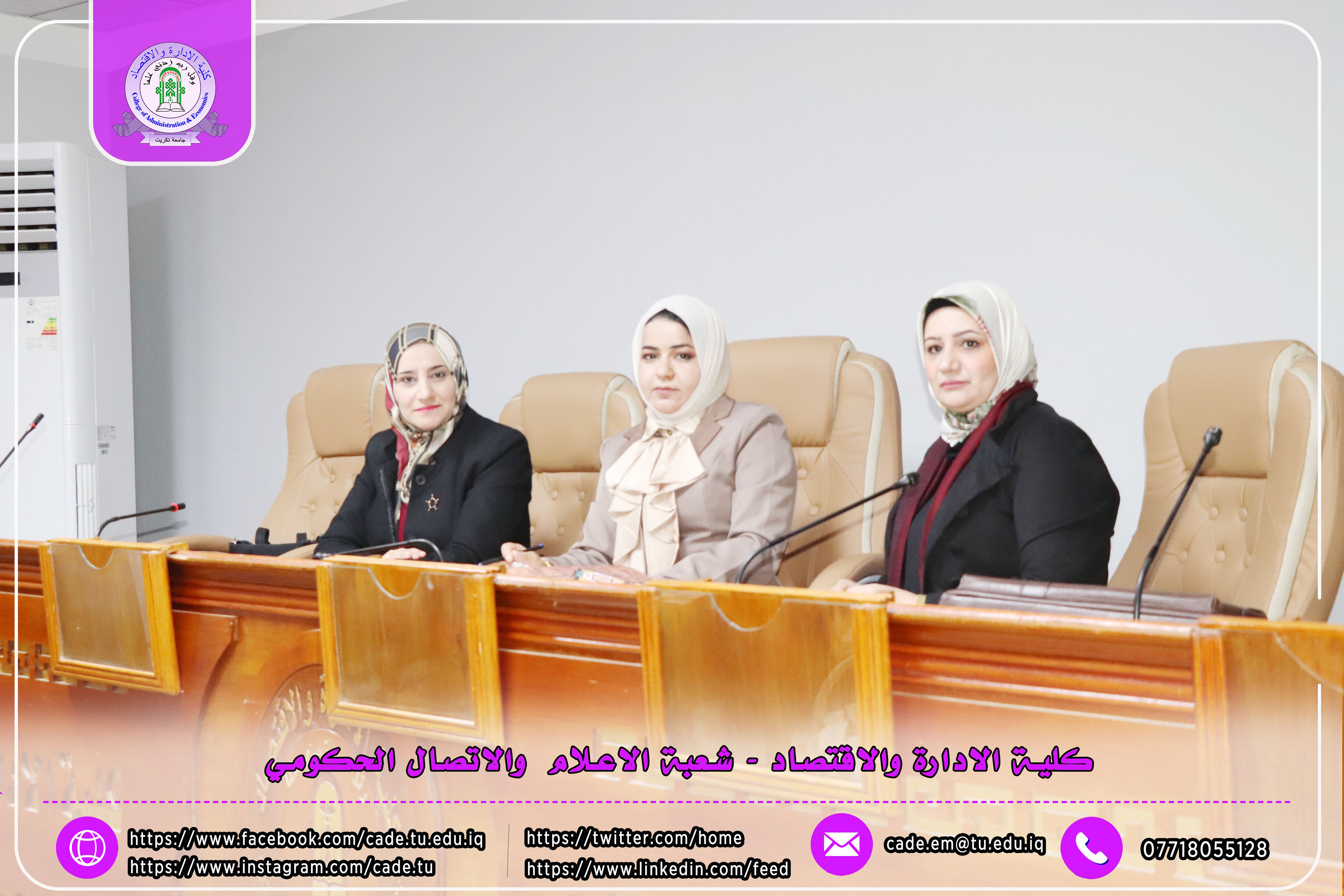 برعاية الأستاذ الدكتور وعد محمود رؤوف، رئيس جامعة تكريت، وبإشراف الأستاذ المساعد الدكتور فؤاد فرحان حسين، عميد كلية الإدارة والاقتصاد، أقامت عمادة الكلية / وحدة شؤون المرأة ندوة علمية بعنوان (بناء القدرات الرقمية: من أساسيات التكنولوجيا إلى مهارات التسويق الرقمي)، وذلك يوم الثلاثاء الموافق 10/2/2026 على قاعة قسم إدارة الأعمال.